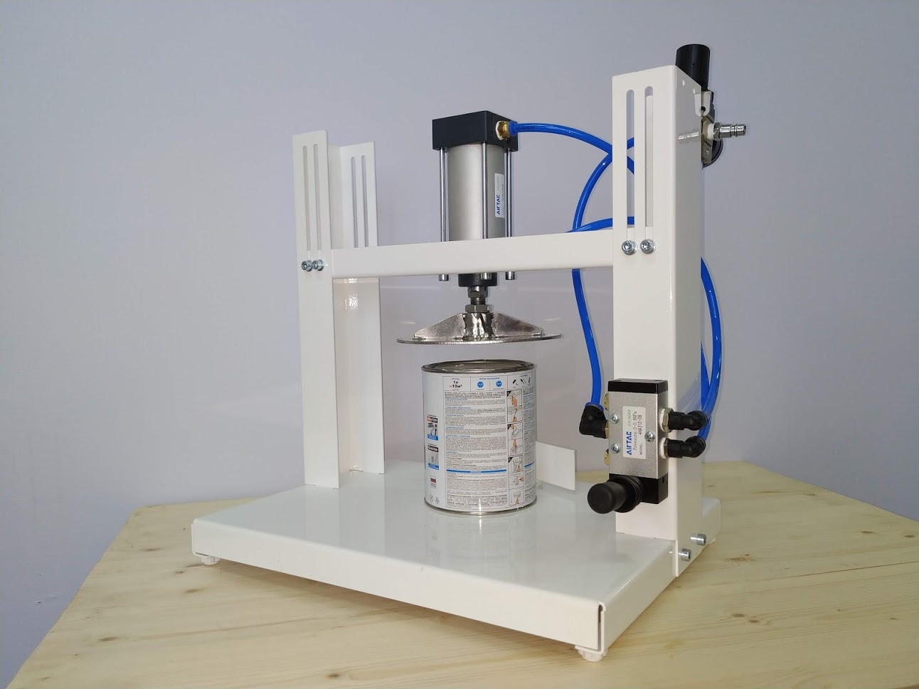 Укупорочная полуавтоматическая машина для крышек без резьбы ("защелкивающихся"). Подходит для жестяных банок с краской, лаком, маслом, для ведер и ведерок, банок, флаконов и бутылок.