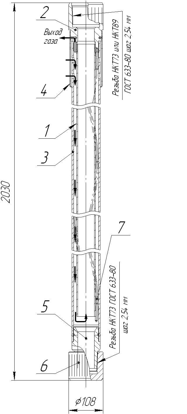 Якорь газопесочный ЯГ73.003 своей внутренней конической резьбой крепится на колонне системы НКТ. Присоединительная резьба НКТ ГОСТ 633-80, шаг 2,54 мм. Муфта НКТ 73, или НКТ 89. Башмак нижний НКТ 73. Фильтрующий элемент: сетка 1-040-025-130 12Х18Н9Т ГОСТ 3826-82. Диаметр эксплуатационной колонны 140, 168мм. Габаритные размеры: длина не более 2030 мм, диаметр не более Ø108мм. Масса не более 38,7 кг. Рабочий диапазон пропускной способности до 300 м3/сут. Конструкция позволяет производить технологические промывки насосного оборудования в объемах до 24 м3 за 2,5-3 часа. Микротвёрдость частиц до 7 баллов по Моосу. Максимальное содержание механических примесей до 50 г/л. Минимальный размер механических примесей, фильтруемых якорем 0,07 мм. Способ фильтрации инерционно-гравитационный с механической очисткой. Сепарация газа 60%. Сепарация механических примесей 95%.