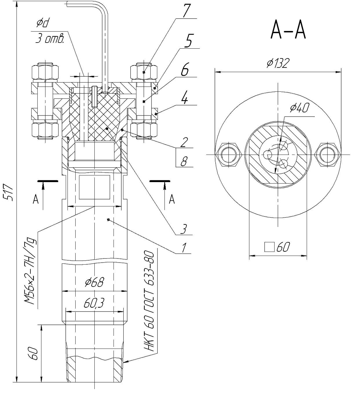 Присоединительная резьба по ГОСТ 633-80 НКТ 60. Габаритные размеры: диаметр 132 мм, длина в затянутом состоянии 517 мм. Масса 9,5 кг.
