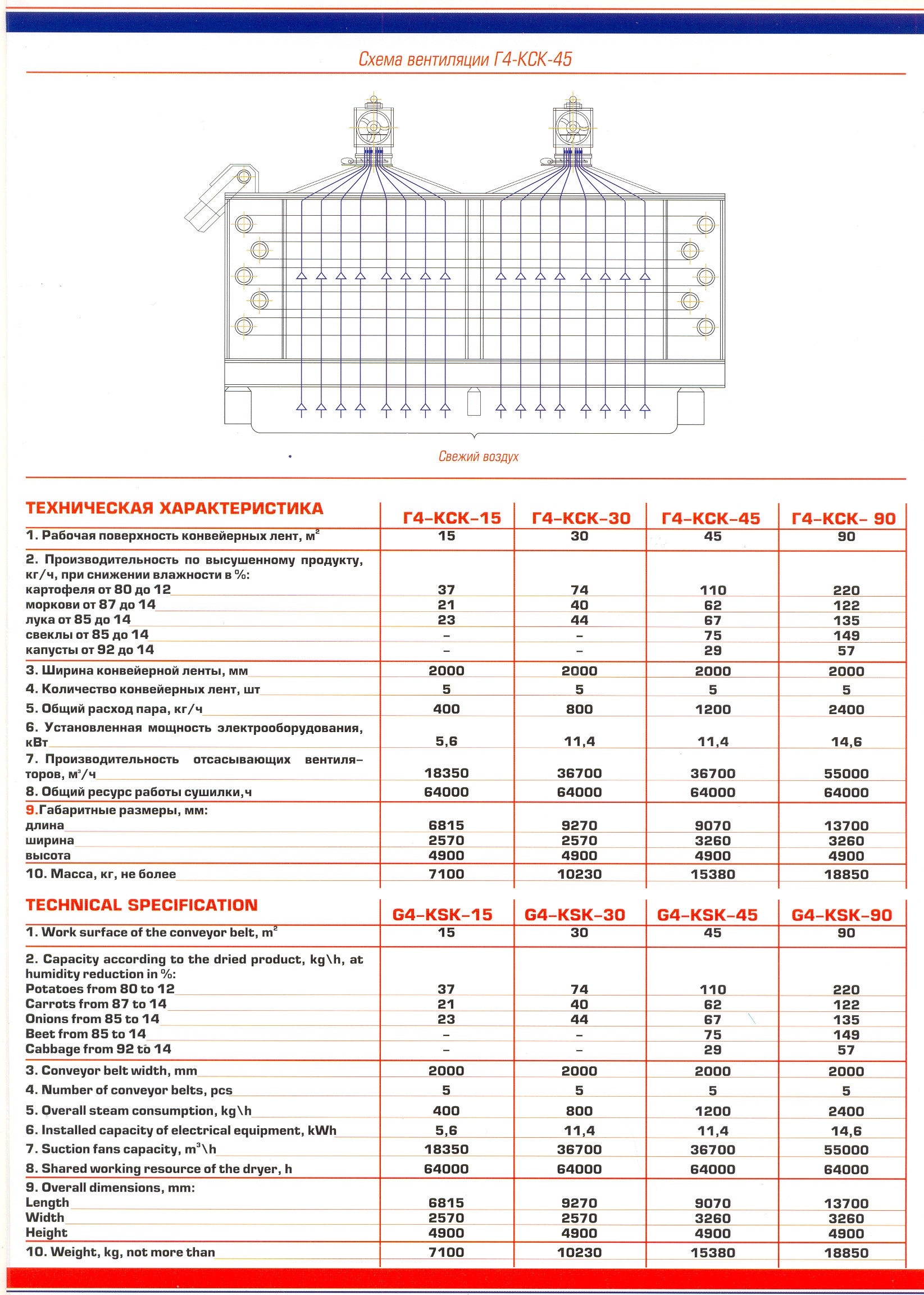 Сушилка представляет собой камеру, закрытую металлическими щитами и дверями, заполненными теплоизоляцией. В начале и в конце сушилки предусмотрены двухстворчатые двери, предназначенные для осмотра камеры внутри с торцов, а также для очистки лент от остаточного продукта. Предусмотрено также освещение над четырьмя сетками в начале и конце сушильной камеры. Внутри сушилки один над другим расположены 5 пар барабанов, На каждую пару барабанов натягивается бесконечная сетчатая проволочная лента из нержавеющей стали. Каждая пара барабанов относительно другой смещены по длине, что предотвращает попадание сырого продукта в сухой при переходе его с одной ленты на другую. На приводных колонках установлены цепные вариаторы с диапазоном регулирования Д=6, которые обеспечивают бесступенчатое регулирование скорости движения конвейерных лент.
