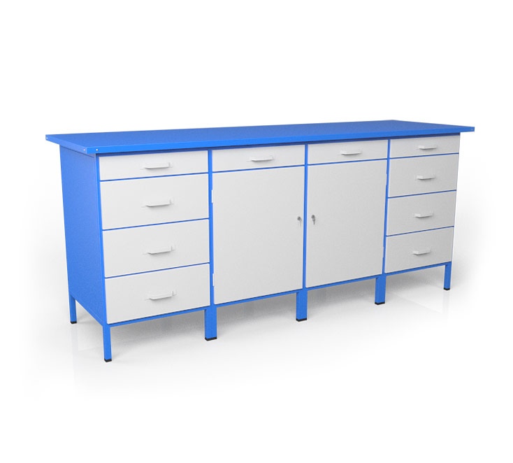 Верстак слесарный четырехтумбовый ВСТ 21/4224 имеет каркасное основание, выполненное из профильной трубы квадратного сечения, обшитое листом металла. Столешница верстака - влагостойкая фанера 24 мм, накрыта листом металла 1 мм (есть возможность изменения толщины металла до 20 мм). В опорах стола установлены пластиковые подпятники (доп. опция - установка регулировки высоты стола).