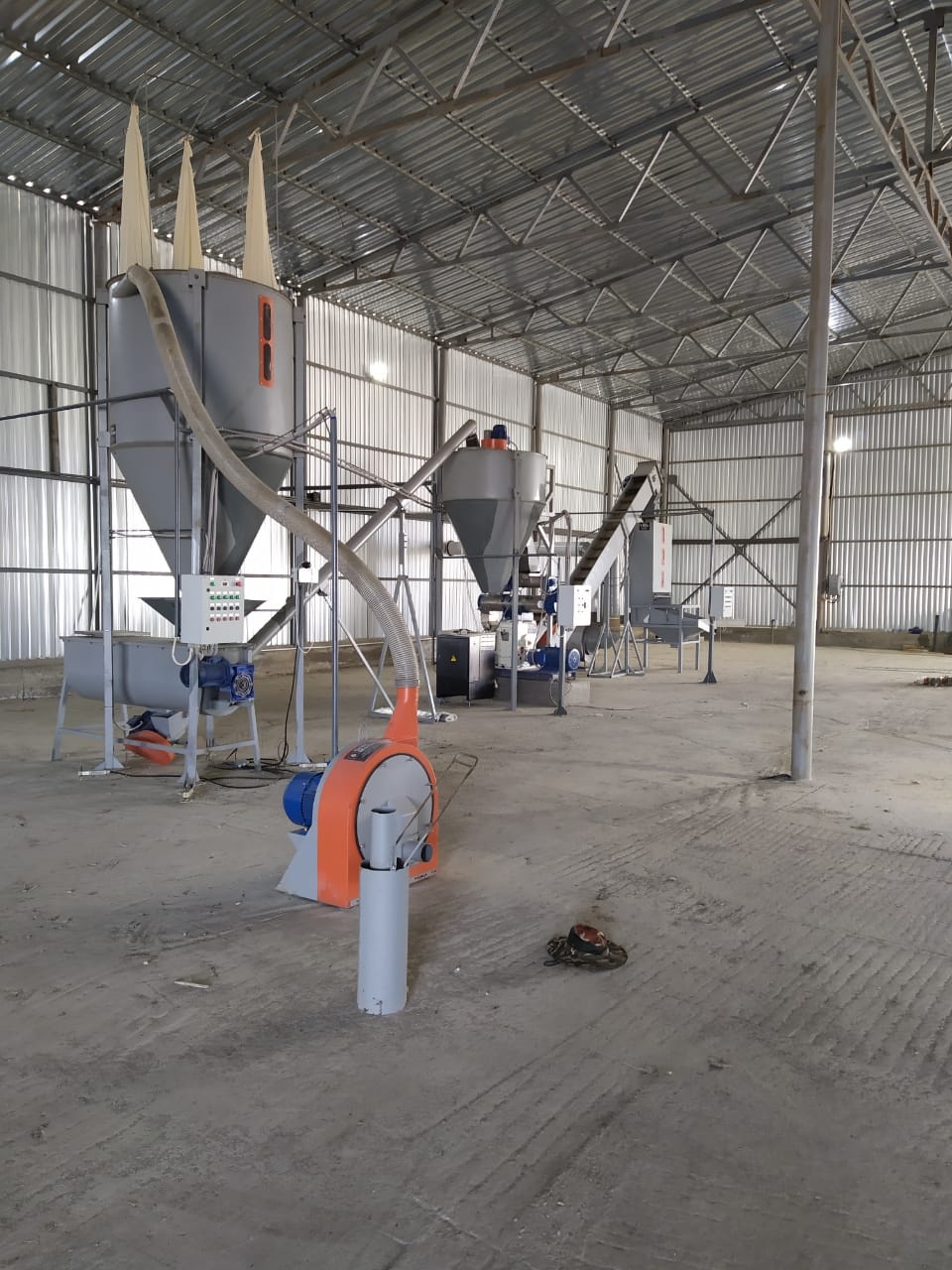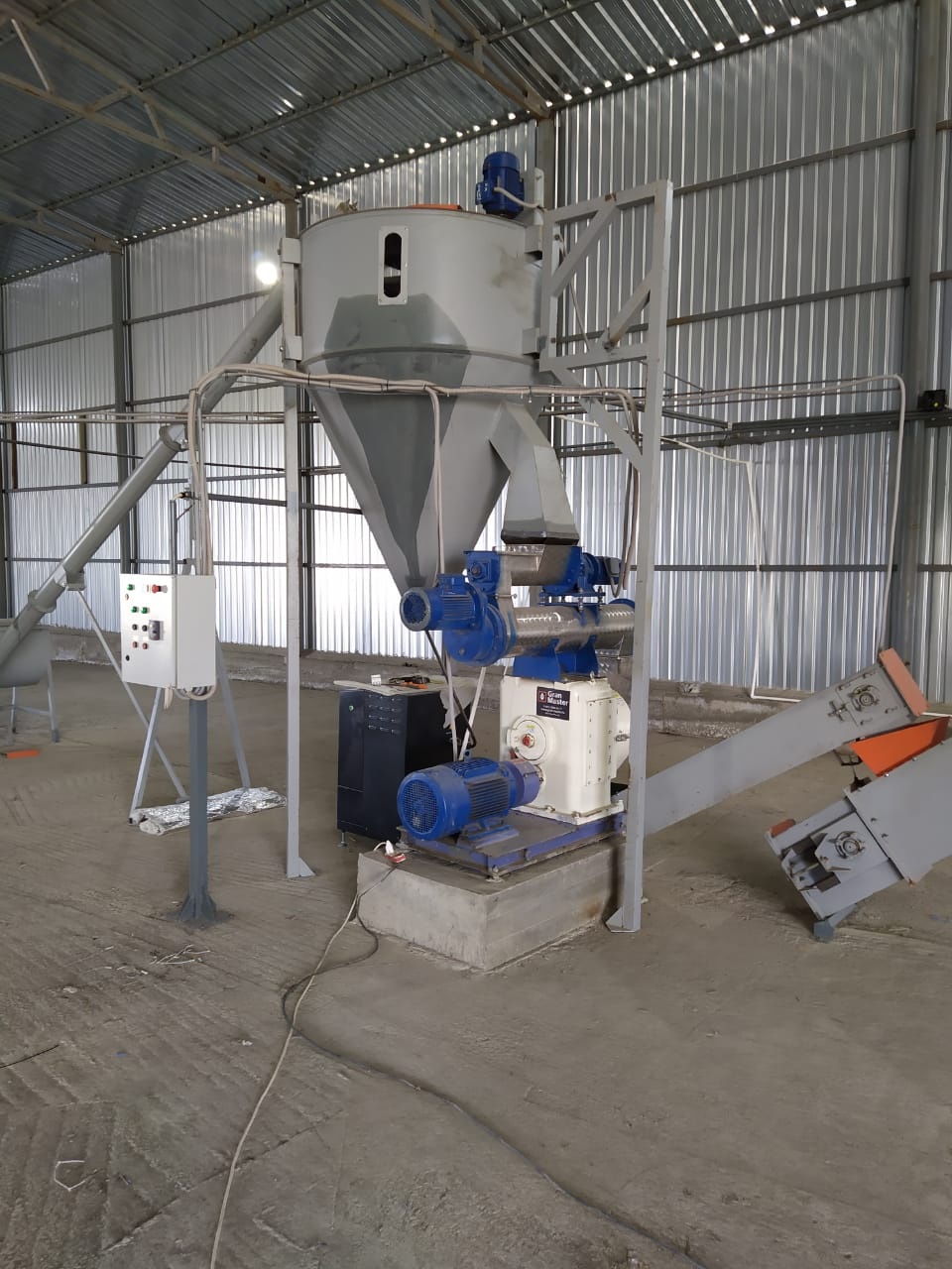 Комплекс производства гранулированного комбикорма для птиц, рыб, кроликов и т.д. Производитльностью до 1 т/ч. С различными рецептурами. Состоит из дробилки 18,5 кВт, аспирационного бункера, весового дозирующего устройства, горизонтального смесителя 0,5 м.куб., конвейера винтового 6 м.,бункера ворошителя лопастного 5,5 кВт.,пресс-гранулятора мощностью 20,5 кВт., транспортеров ленточно-скребковы 2 м и 8 м., колонки охлаждения со столом проссеивания мощностью 6,62 кВт., блок управления оборудованием. Все оборудование новое, на гарантии. Можно производить комбикорма различных рецептур.