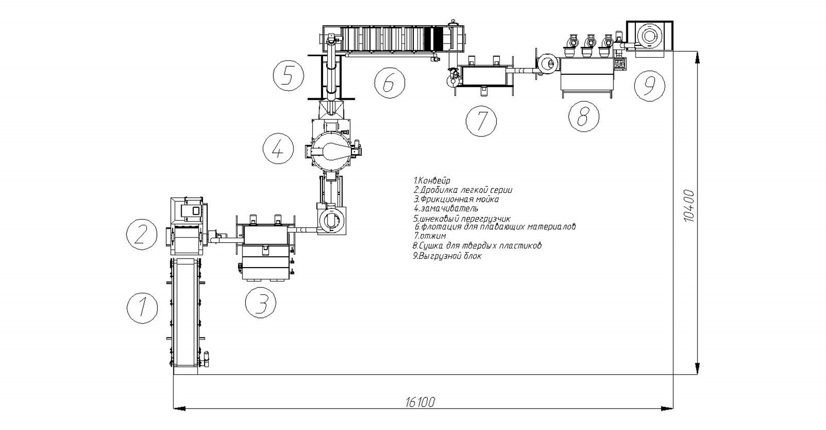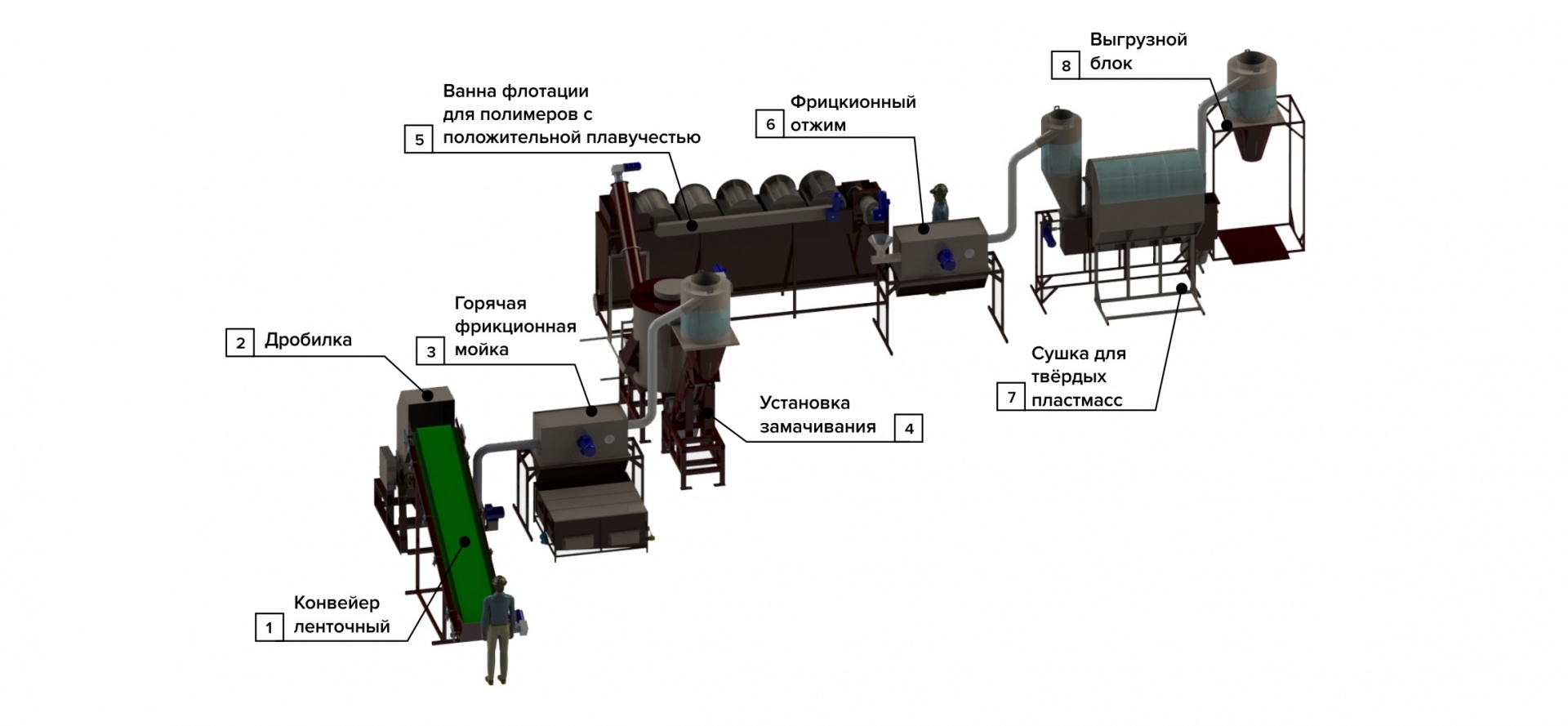 В продаже испытанная линия переработки твердого пластика (твердые тонкостенные отходы плавающих полимеров: канистры, ящики, ведра и т.п.). Общая характеристика линии: производительность 400 кг/ч, установленная мощность 163,8кВт, "крейсерская" потребляемая мощность 131кВт/ч.