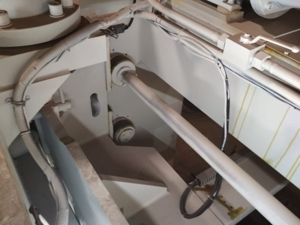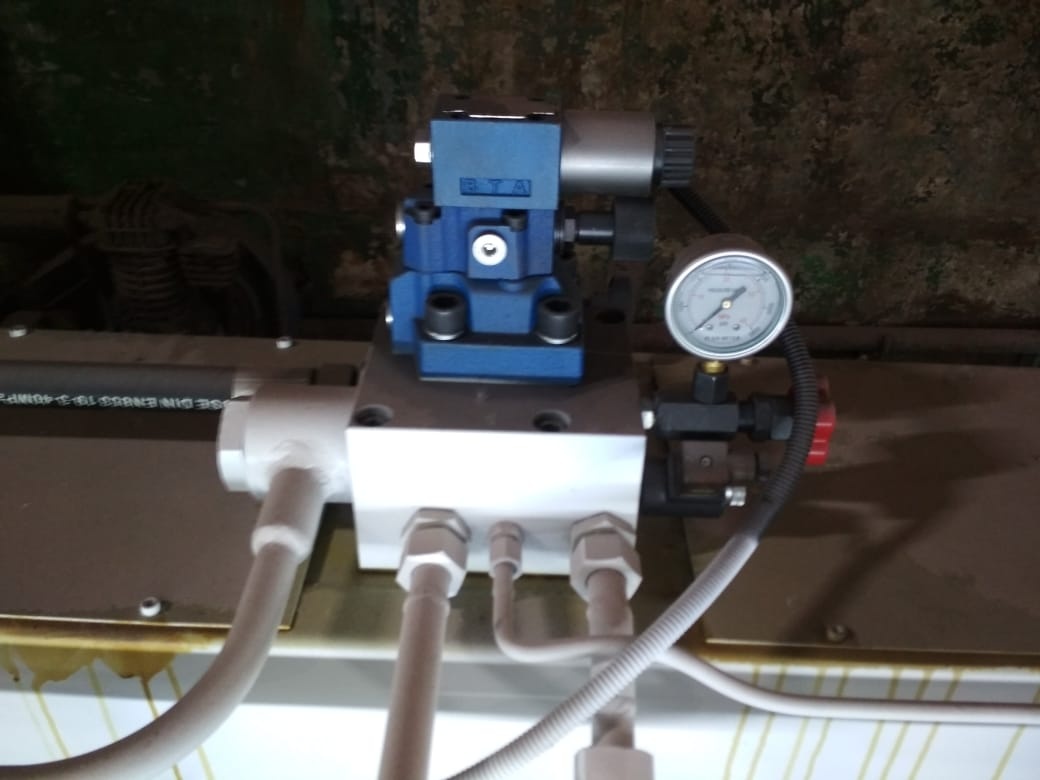 Процесс резки металлического листа осуществляется посредством скольжения верхней балки, на которой установлены четырехсторонние ножи. Процесс скольжения выполняется под давлением гидравлических цилиндров. Перемещение ножевой балки происходит в направляющих прижимной балки по роликовым опорам.