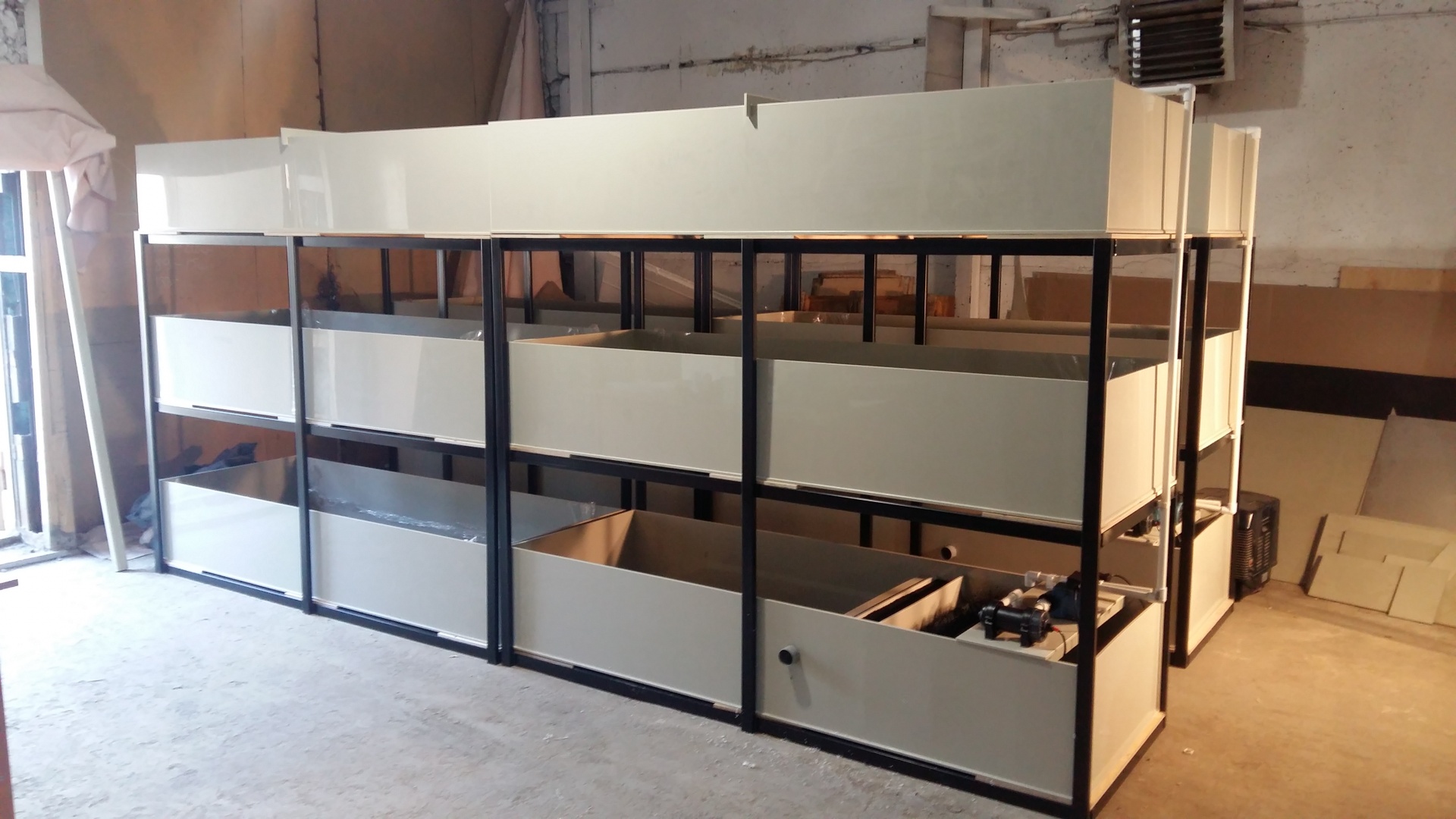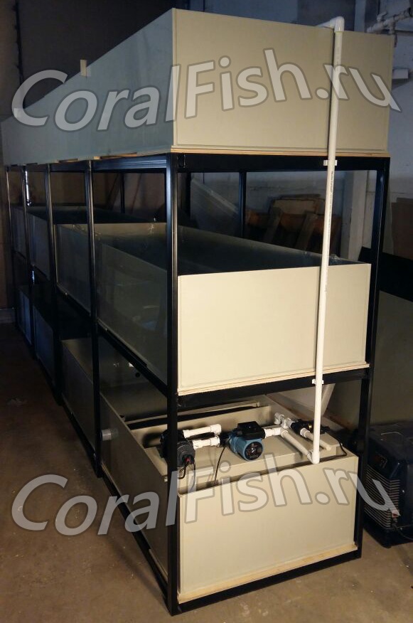 - Модули для выращивания креветок; представляющие собой, стойку в виде шести емкостей сдвоенных между собой , прямоугольной формы, выполненных из полипропилена толщиной 8 мм. (марка VIKULEN) и размещенных на трёх уровнях металло-каркаса. Модуль автономен полностью, но позволяет включить неограниченное кол-во дополнительных модулей с подключением оборудования водоочистки и водоподготовки. Модули УЗВ сконструированы таким образом, чтобы обслуживание и уход были минимальными. Учитывая автоматическую работу системы циркуляции, ее техническое обслуживание сводится только к периодическому визуальному контролю, мониторингу состояния гидробионтов, кормлению.
