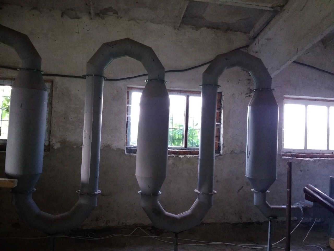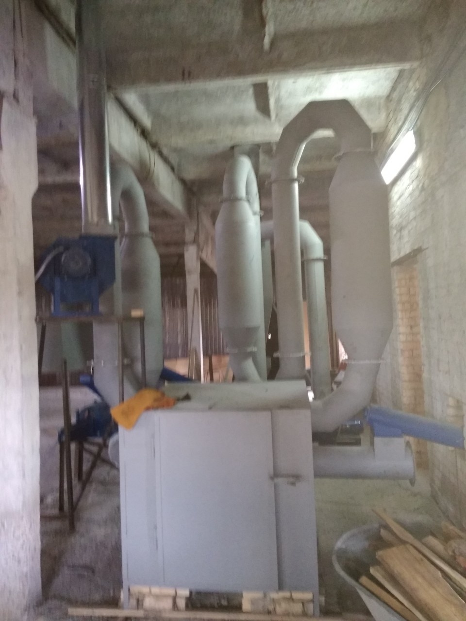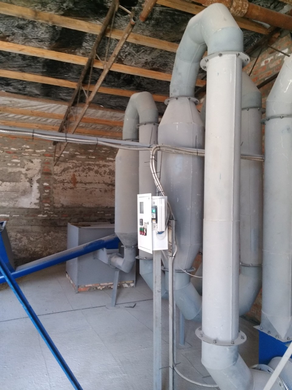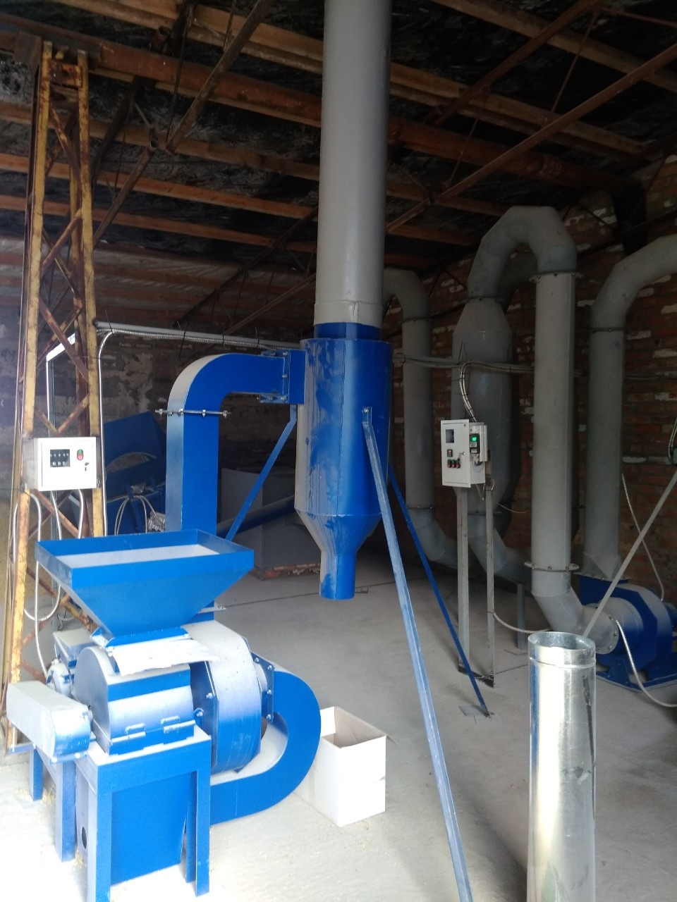 Сушильный комплекс предназначен для удаления влаги из измельченного сырья (опилка, с/х отходы и др.) посредством смешивания сырья с потоком горячего воздуха., сушильный комплекс состоит из металлического каркаса теплогенератора, приемника сырья, воздуховодов с расширителями, вентилятора, циклона. Для контроля температуры используется термодатчик.