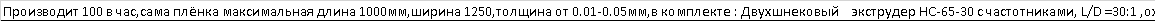 | Производит 100 в час,сама плёнка максимальная длина 1000мм,ширина 1250,толщина от 0.01-0.05мм,в комплекте : Двухшнековый экструдер HC-65-30 с частотниками, L/D =30:1 ,охлаждающие валки,1000 макс длина намотки ,плёнка обрезаеться в потоке с частотником,Система утилизации кромки.Система управления: система контроля температуры SKG,полнотью автоматическая система на основной двигатель есть отдельный контроллер. |