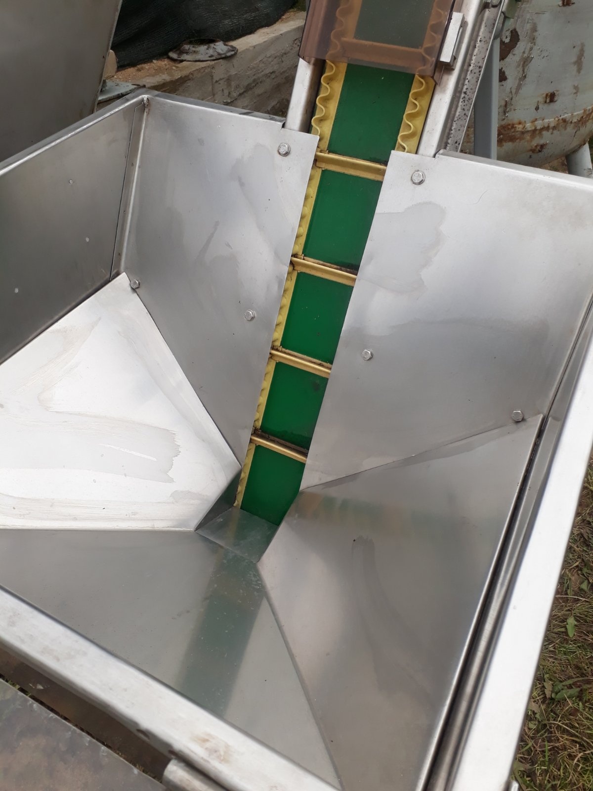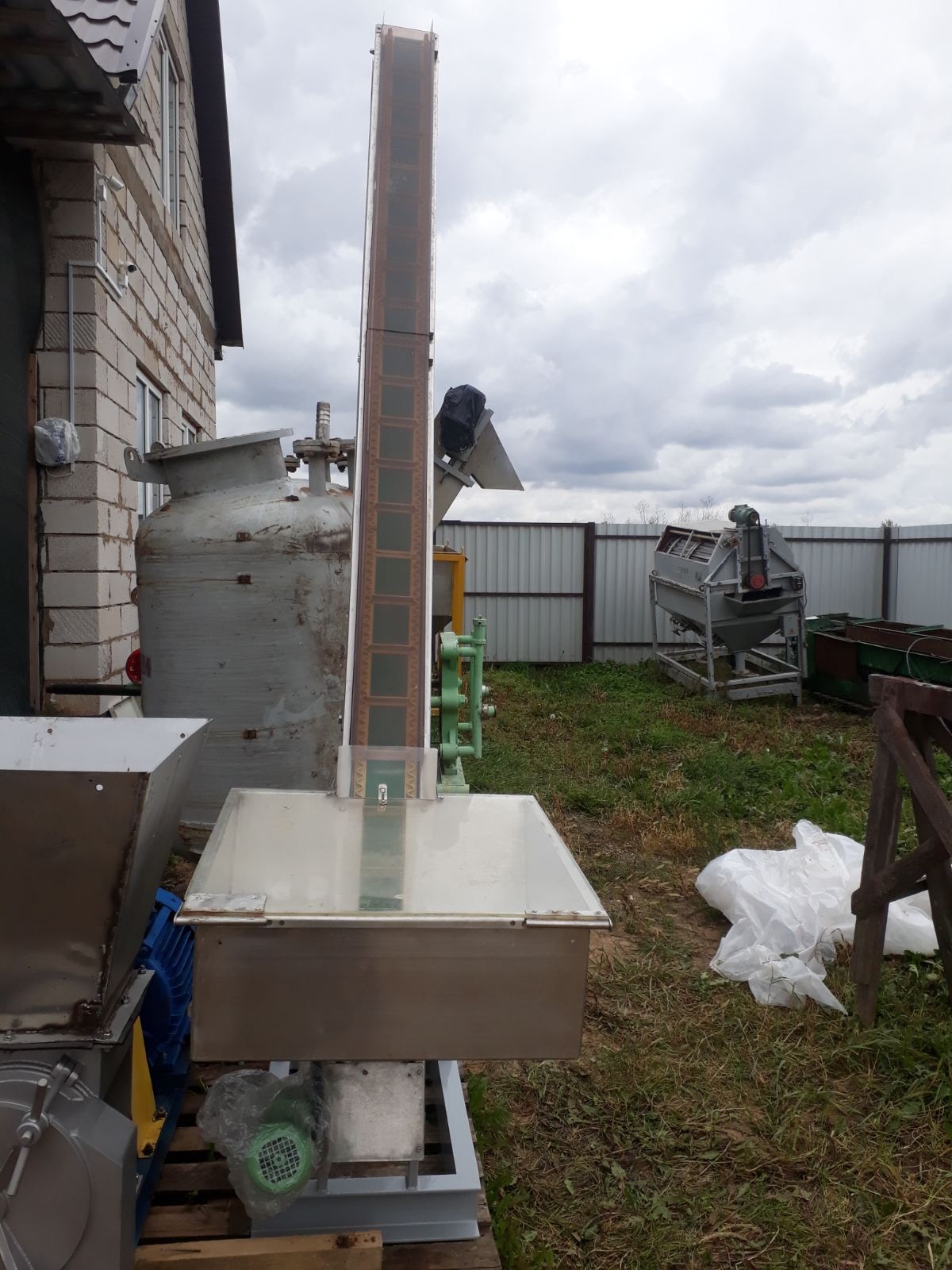 Транспортер идеально подходит для семян, ягоды и др. мелкой фракции. Ширина 160 мм. Бункер 700х700х450(с конусом). Высота загрузки 0.9 м, высота выгрузки 2.7 м