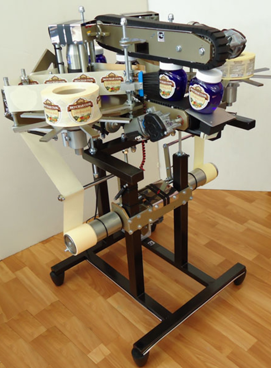 Этикетировочная машина выполнена в виде напольного устройства, имеет два узла наклейки этикеток и подающий тару транспортер. Для нанесения переменной информации (срок годности, № партии, дата выпуска и т.п.) на машину может быть установлен принтер .