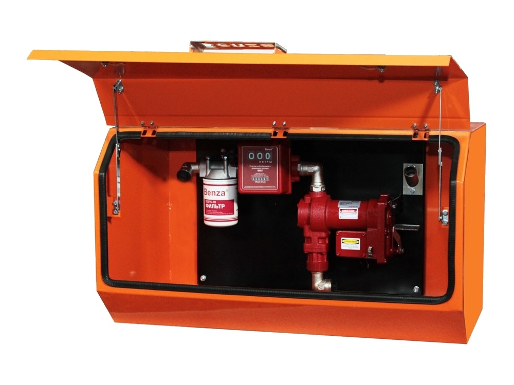 Станция перекачки топлива Benza 37 используется для бензина и солярки. Основные рабочие элементы мини заправки: электронасос, заправочный пистолет, счетчик, раздаточный шланг. Все они, смонтированы в горизонтальном ящике, который служит защитой от повреждений и осадков. Крышка ящика плотно прилегает благодаря резиновым уплотнениям и гидравлическому цилиндру. Данный заправочный модуль для бензина легко транспортируется. При необходимости, его можно установить на раму соответствующего автотранспорта. Эта модель мини заправки функционирует от электросети 12 Вольт.