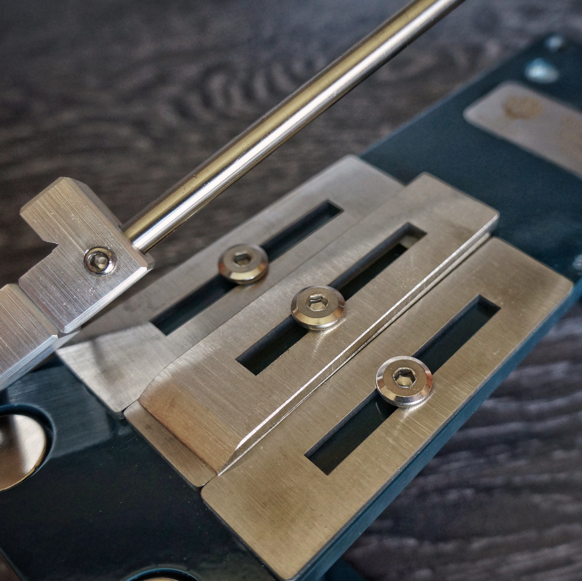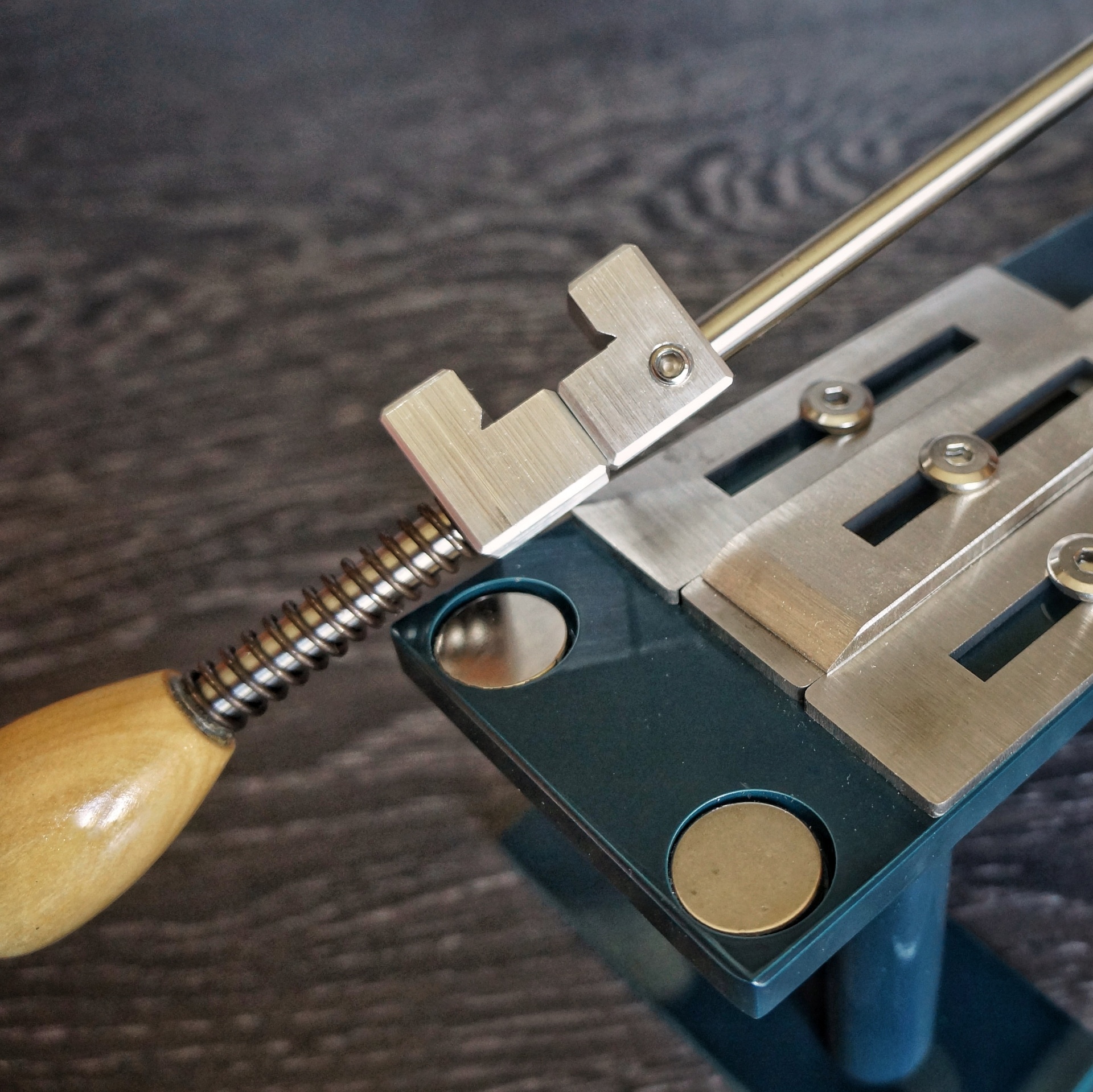 Горизонтальная направляющая, 3 части ножевого упора, и 2 держателя абразива выполнены из металла, у которого отсутствует магнетизм, что исключает полностью контакт с установленными магнитами. В результате чего процесс заточки проходит плавно, и без ограничений.