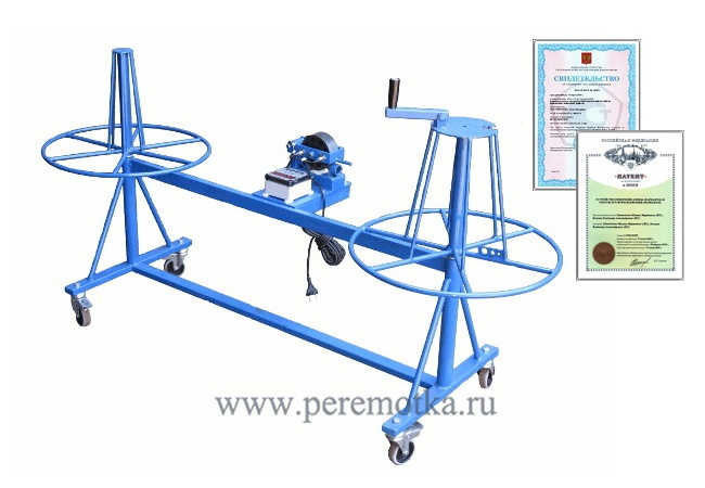 Станок легкого класса, предназначен для перемотки кабеля с бухты на бухту. Состоит из: измерителя длины с герметичным электронным счетчиком импульсов ИД-2, приемной части и отдающей части. На приемной части имеется съемная ручка, вращая за которую оператор производит намотку кабеля. Наличие колесных опор позволяет одному оператору легко перемещать станок по территории склада.