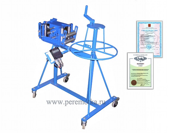 Устройство для намотки кабеля в бухты УНК-6Р с ИДМ-20 - Станок легкого класса, предназначен для намотки кабеля в бухту. Состоит из измерителя длины с герметичным электронным счетчиком импульсов ИД-2, приемной части. На приемной части станка имеется съемная ручка, вращая которую оператор производит намотку кабеля. В качестве отдающей части может использоваться многоярусная стойка, стойка для размотки бухт, стеллаж для хранения бухт. Наличие колесных опор позволяет одному оператору легко перемещать станок по территории.
