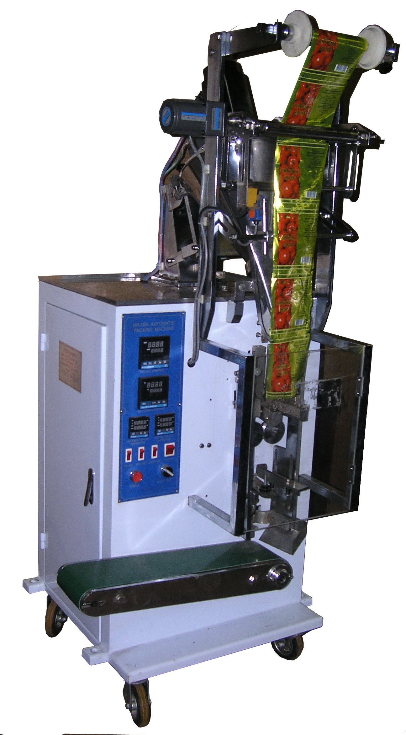 Фасовочно-упаковочный автомат HP100P предназначен для фасовки и упаковки плохосыпучих продуктов и порошков в формируемые из термосвариваемых материалов (ПЭ, фольга/ПЭ, бумага/ ПЭ, ПП/ПЭ, термосвариваемая фильтр-бумага для чая, фольга и т.п.) пакеты типа “саше”. Весь процесс – дозирование, формирование пакета из рулона ленты, заполнение его продуктом, герметичное запаивание пакета, его отрезание и подача его по отводящему конвейеру – происходит автоматически. Автомат фасует порошки, фармацевтические препараты, кофе растворимый, пищевые добавки, ванилин, специи, химические препараты и т.д.