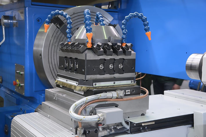 Станок оснащается двумя самоцентрирующимися четырёх кулачковыми патронами, наружным диаметром 720мм и внутренним 300мм.