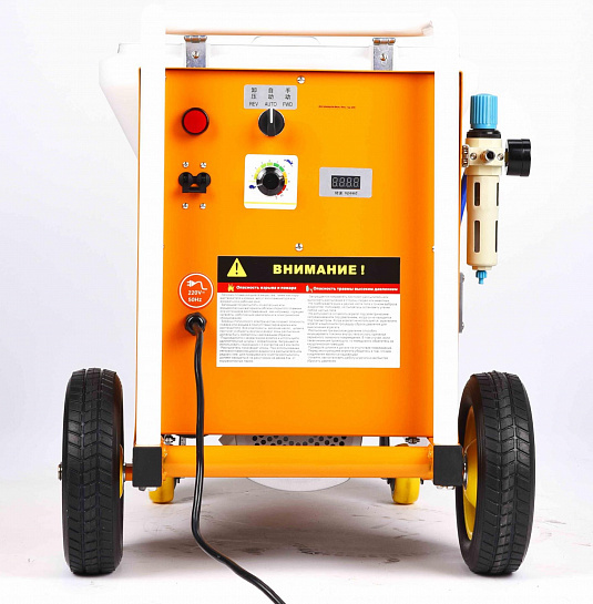 Для перекачивания готового строительного раствора используется винтовой насос (шнек). Он перекачивает смесь из бункера в напорный шланг, откуда смесь попадает на растворный ствол. При открытии крана на растворном стволе, агрегат автоматически включается и происходит смешивание раствора с сжатым воздухом от компрессора. Проходя через сопло, раствор приобретает определённую форму (зависит от диаметра сопла) и распыляется на поверхность. При закрытии крана, агрегат отключается.Мощность двигателя составляет 2800Вт, максимальное давление на выходе – 30 бар. Благодаря этим характеристикам ASPRO-N5 способен подавать раствор на расстояние до 30 метров от своего местоположения. Максимальная высота подачи раствора- 20 м. При этом производительность установки, составляет 18 л/мин.