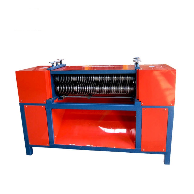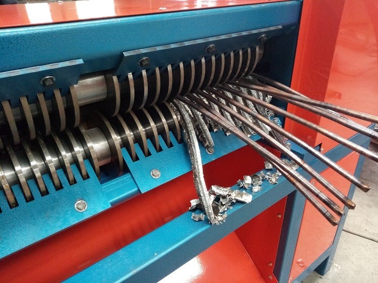 Станок имеет 2 электродвигателя 3 и 4 кВт. Первый электродвигатель предназначен для захватывания радиаторов и подачи их в станок, второй электродвигатель отвечает за работу вала с ножами для разрезания радиаторов вдоль медных трубок.