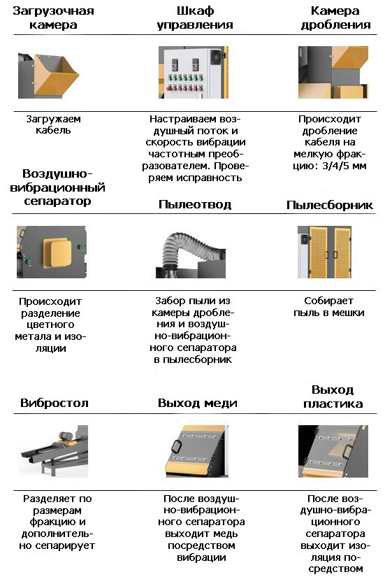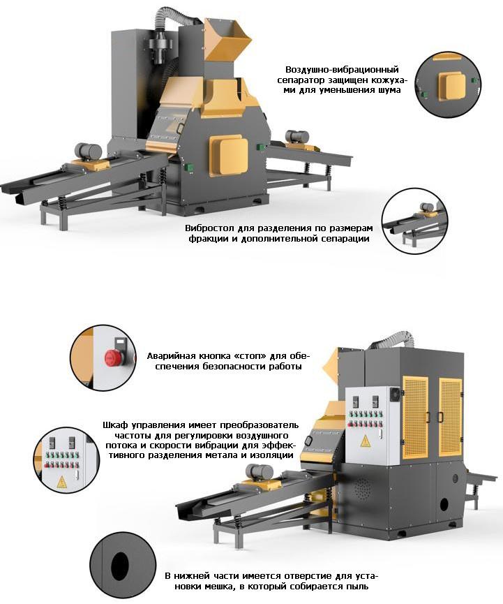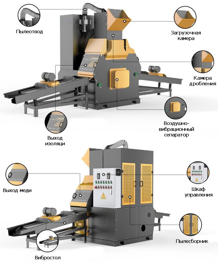 Провода загружаются в оборудование, где путем измельчения ножами и дальнейшей сепарации (воздухом на вибростоле), разделяются на две фракции: на изоляционную и металлическую сечку (крошку). Процент сепарации достигает 99,9%. Таким образом, на выходе получается два готовых чистых продукта для последующего использования. Металлическую сечку можно напрямую отправлять на заводы для переплавки, а пластик использовать для вторичных целей. Пыль воздуховодом собирается в пылесборнике.