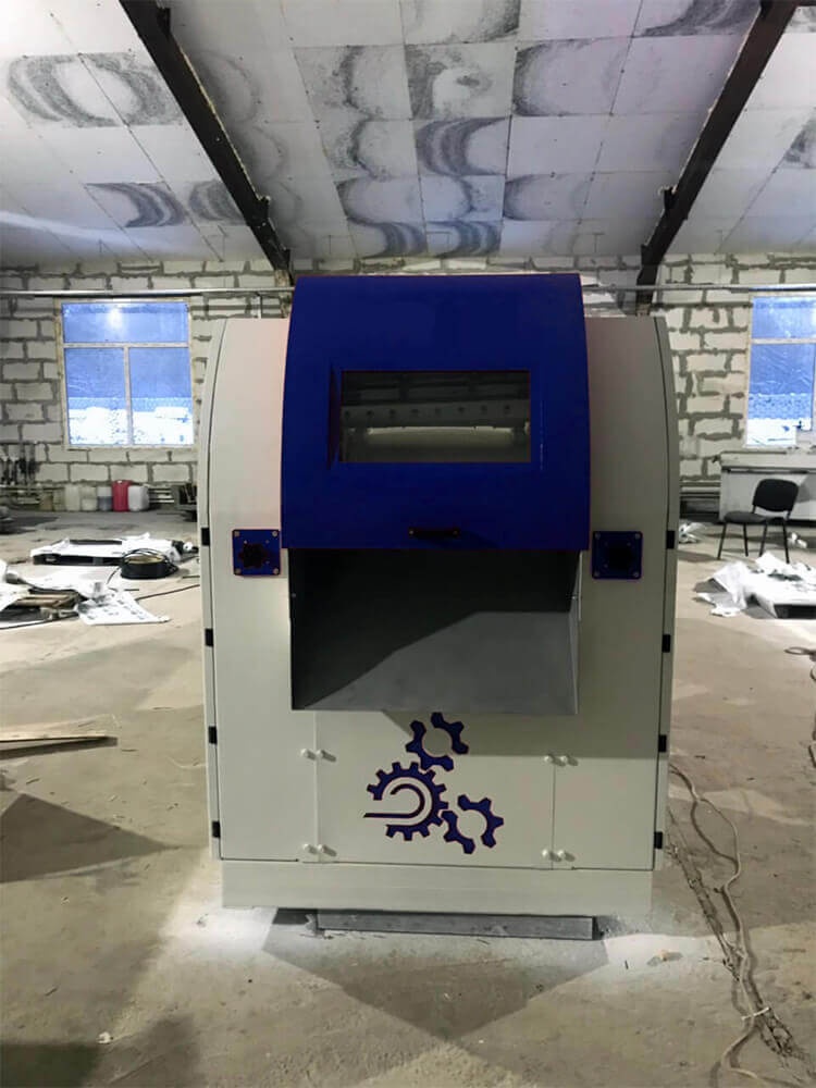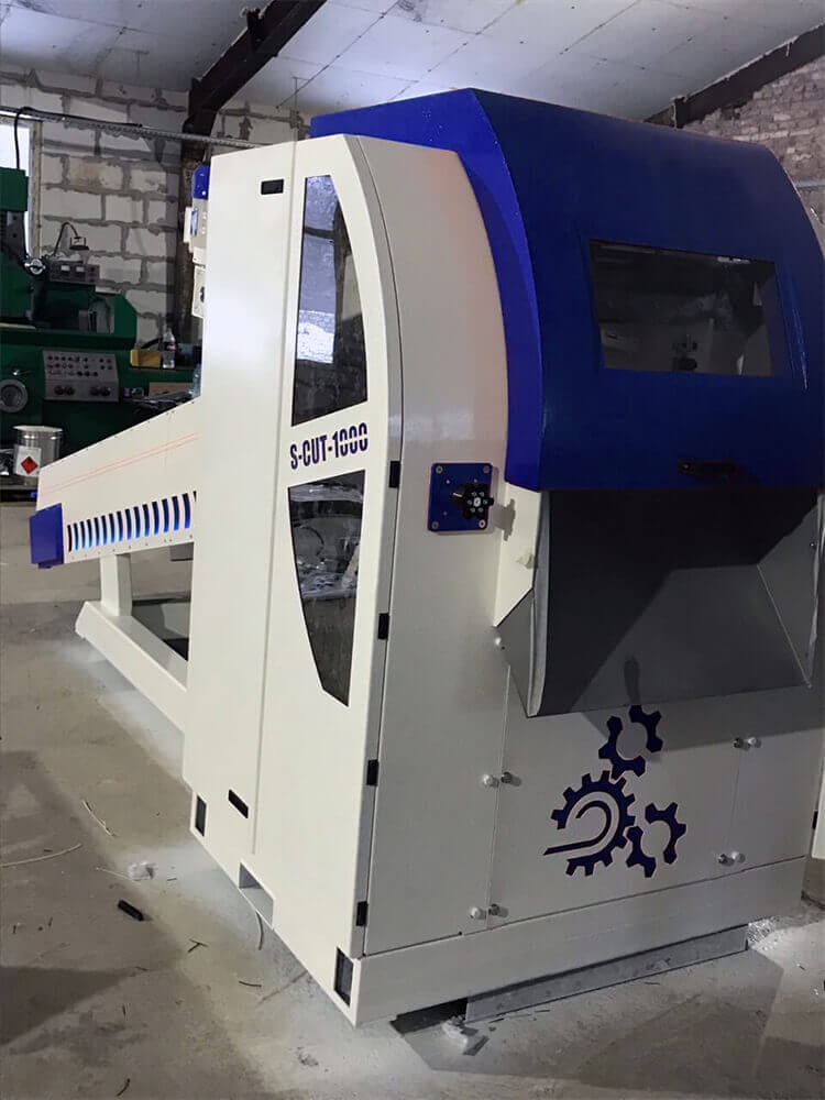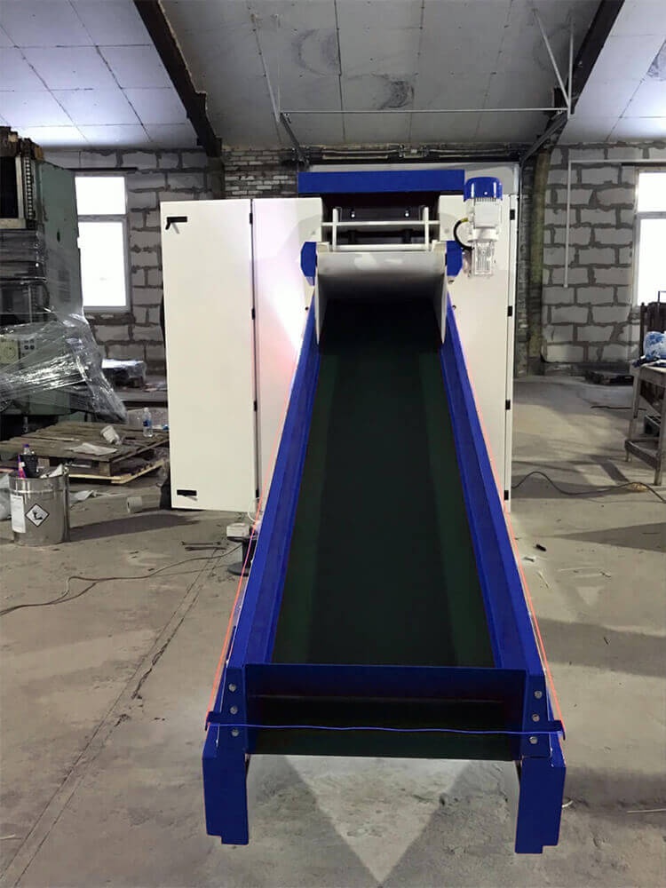 Исходный материал укладывается на ленточный конвейер, по которому транспортируется к прижимным и подающему роликам. Ролики немного уплотняют и подают сырье на стационарный нож. Подвижный нож, двигающийся сверху вниз отрезает полосу сырья и сбрасывает ее вперед на лоток выгрузки. Ширина отрезаемого материала регулируется скоростью ленточного транспортера и роликов.