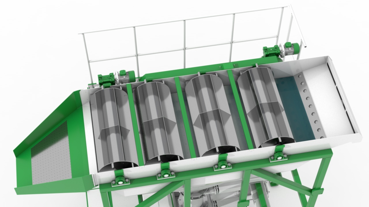 Продвижение сырья вдоль ванны происходит за счет потока воды, подаваемого в зону загрузки насосом, установленным в емкости слива воды, а также при помощи транспортировочных барабанов.