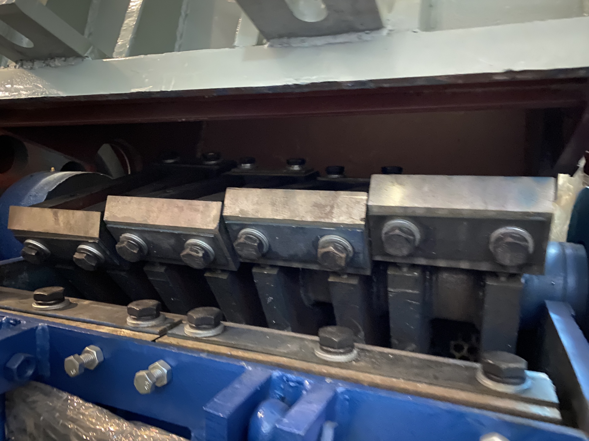 Расположение ножей под дробление твердого плаcтика по схеме "лесенка", 4 ударных ножа в 3 ряда. Увеличивая зазор между подвижными и неподвижным ножами, можно добиться дробления более габаритного материала. Двигатель 37 кВт.