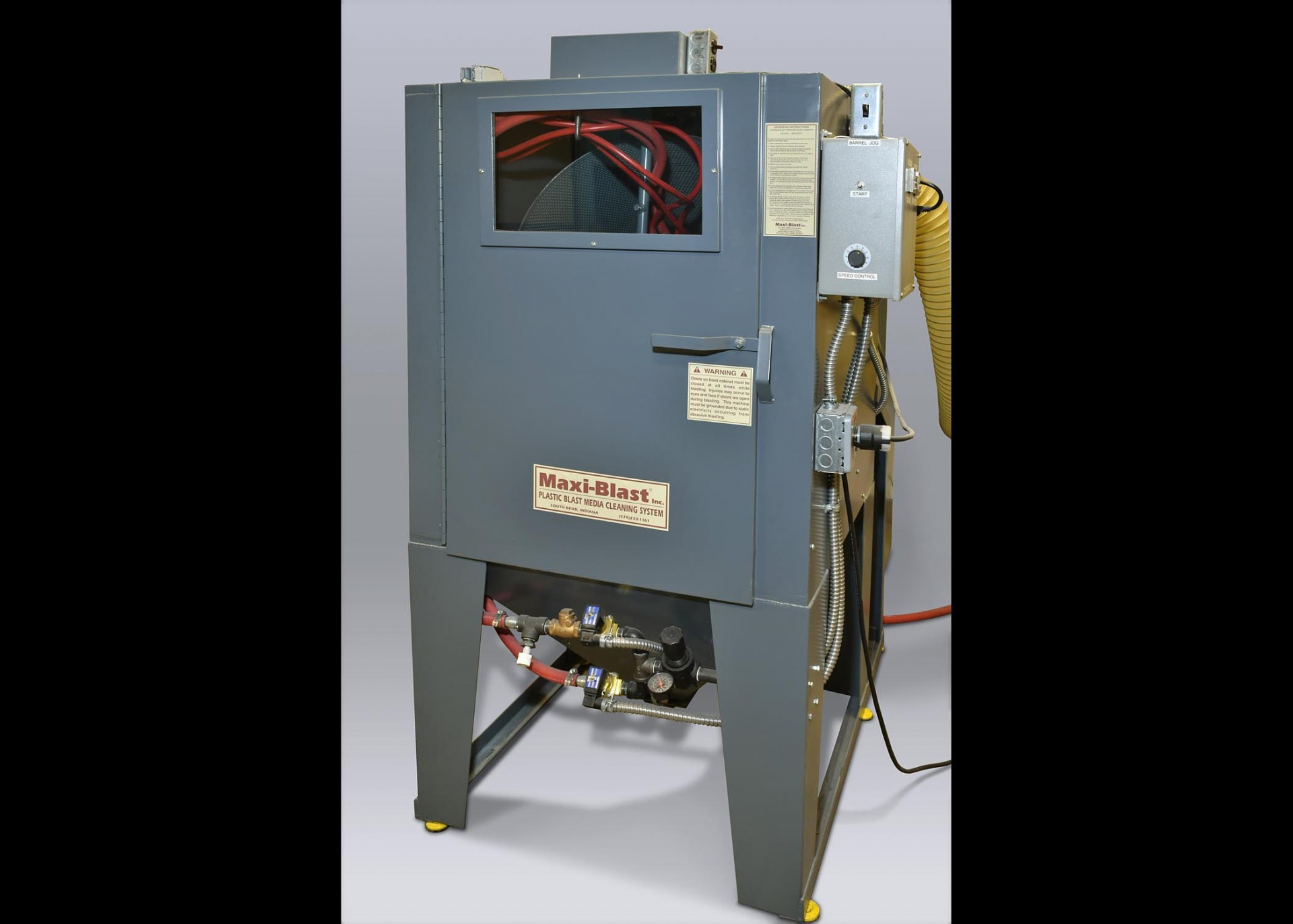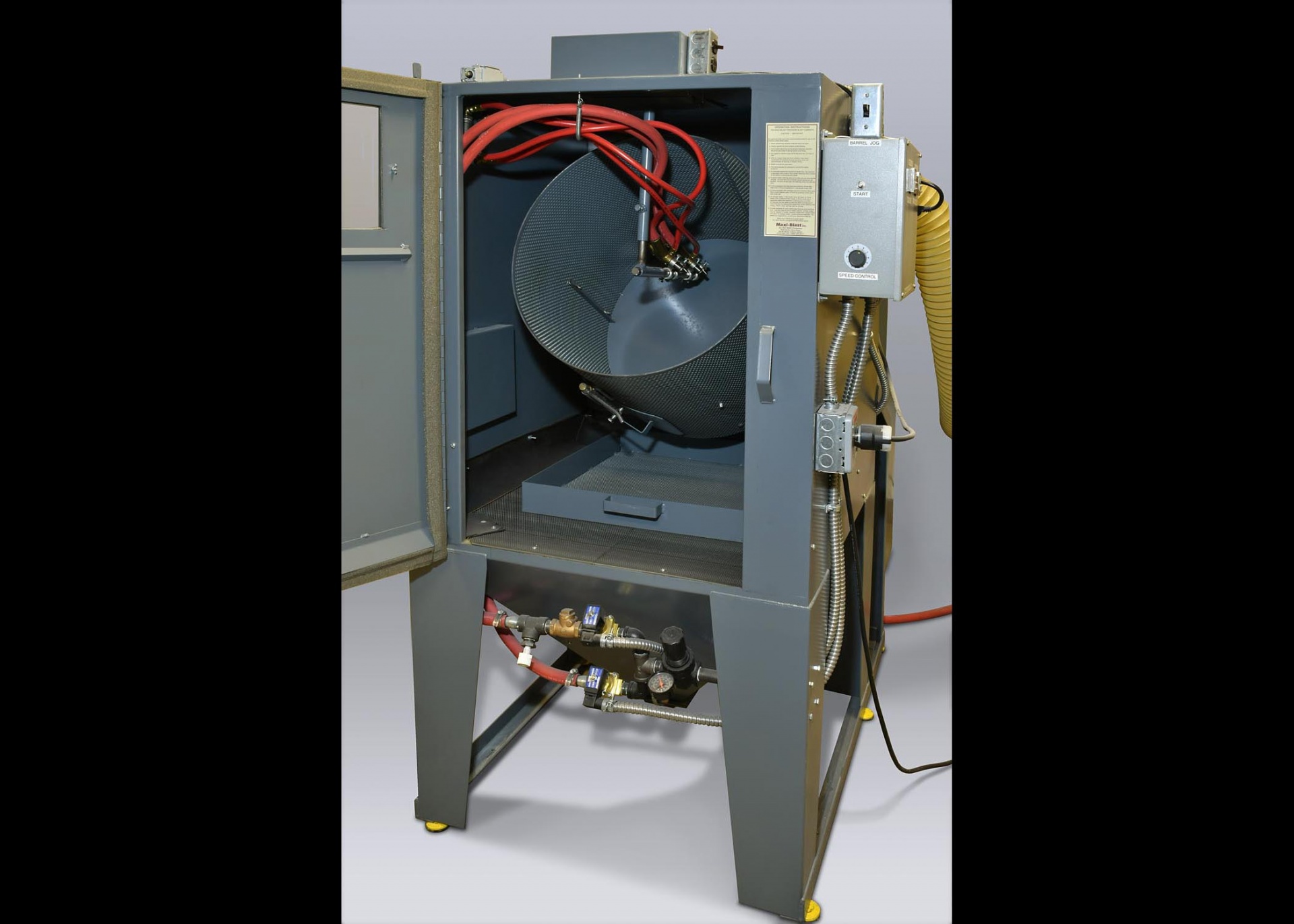 Камеры очень просты в эксплуатации. Загрузите изделия во вращающийся барабан, закройте дверь, установите таймер и включите пылесборник. Барабан вращается с медленной скоростью - 2 об/мин, осторожно подвергая все части струйной обработки пластиковой дробью.