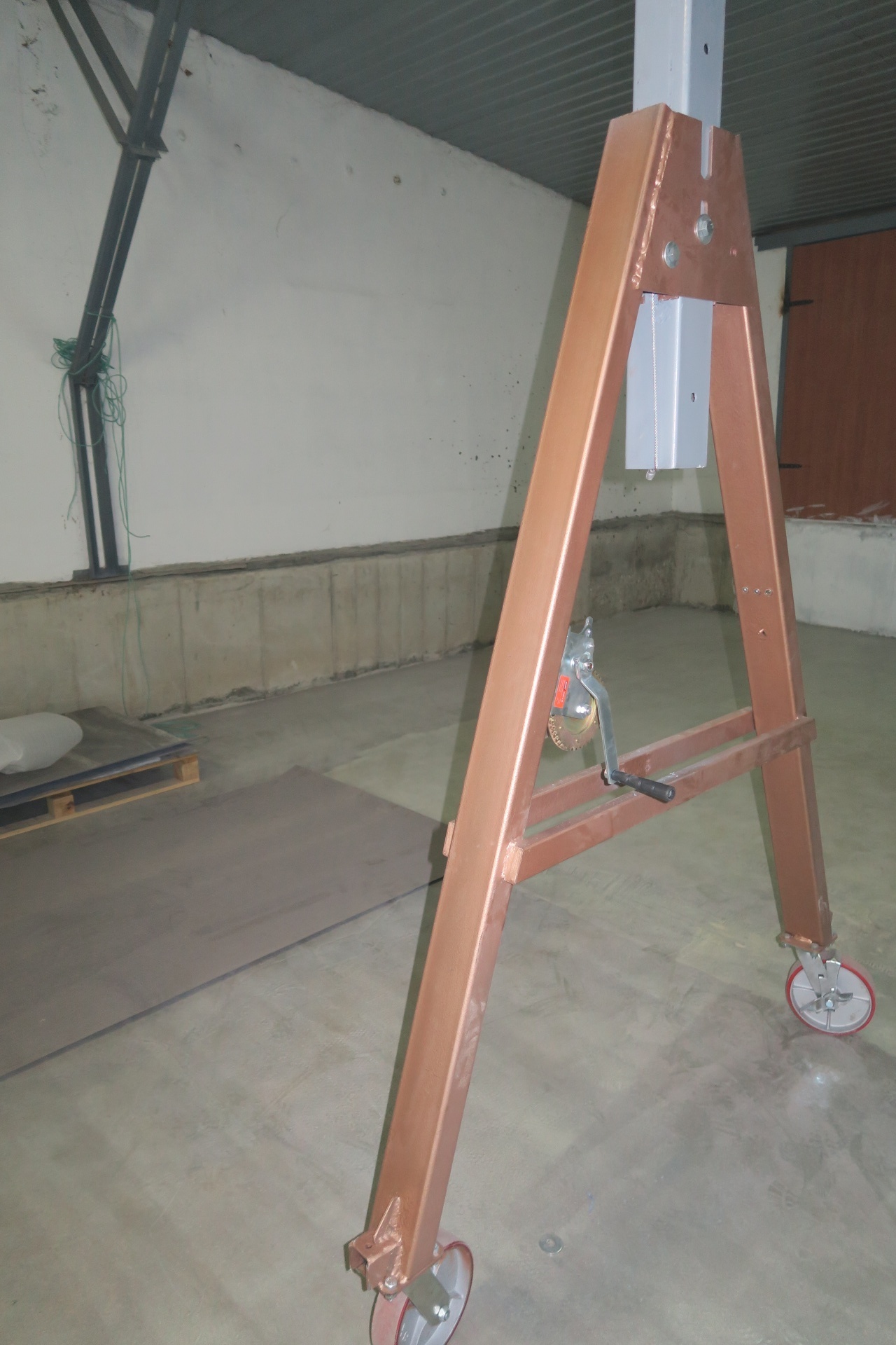 Регулируется по высоте. Кран рассчитывался для эксплуатации в помещениях имеющих стандартный дверной проем 2000 мм, в опущенном положении габаритная высота 1950 мм. Стойки поворачиваются относительно верхней балки, может проходить в узкие дверные проемы с опущенной балкой и развернутыми стойками. Устройство могут собрать и поставить в вертикальное положение два человека.