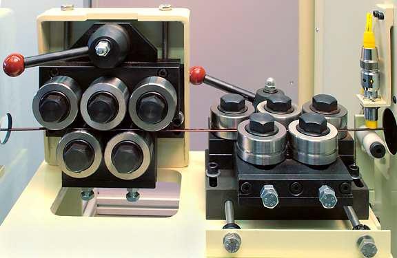 Автомат RW разматывает провод от бобины, затем происходит протягивание провода с помощью пяти горизонтальных роликов и пяти вертикальных роликов. При этом обеспечивается зачистка провода от изоляции и обрезка провода до заранее запрограммированной длины.