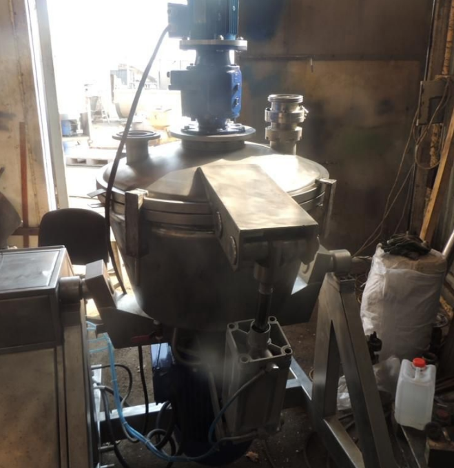 Для более быстрого нагрева продукта внутри чаши расположены два клапана для подачи острого пара непосредственно в продукт.Внутри чаши для измельчения и смешивания продукта находится режущая насадка, которая приводится во вращение электродвигателем. Скорость вращения режущей насадки плавно регулируется преобразователем частоты от 800 об/мин до 3000 об/мин. Для предотвращения появления нагара на стенках чаши при нагреве продукта через стенку рубашки, внутри неё установлена мешалка со скребками из пищевой резины, которые, благодаря своей конструкции, при движении всегда прижимаются к стенкам чаши. Для очистки крышки чаши на мешалке установлен фторопластовый скребок.Крышка чаши при открытии откидывается на 900 назад посредством пневмоцилиндра. На крышке расположена воронка с шиберной заслонкой для догрузки компонентов во время работы смесителя-измельчителя, а также вакуумная камера с клапаном для создания вакуума, с электронным датчиком давления, с предохранительным клапаном и клапаном для сброса вакуума.