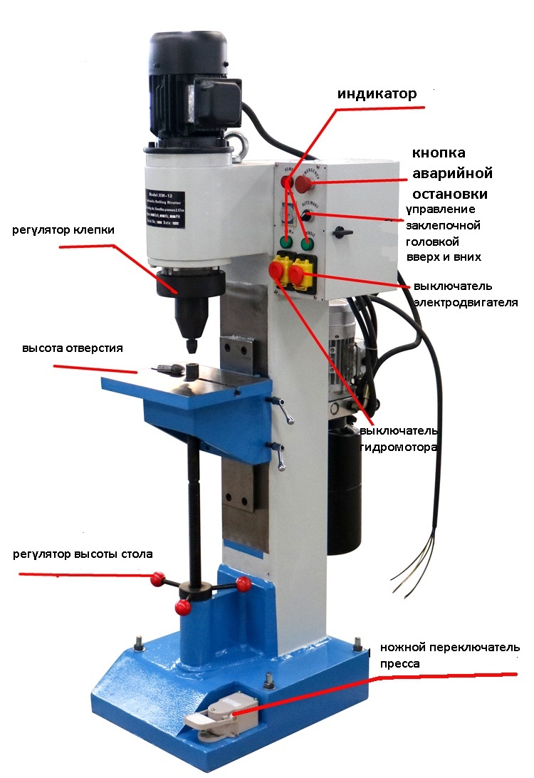 Машина, собственного производства, предназначена для клепания заклепки, которая соединяет две плоские детали. В процессе клепания заклепки образуется грибовидная шляпка. Управление машиной оператор осуществляет нажатием ногой на пневмопедаль. При этом оператор обеими руками может держать две соединяемые детали. После соединения двух деталей одной заклепкой, они могут быть между собой подвижными или неподвижными.
