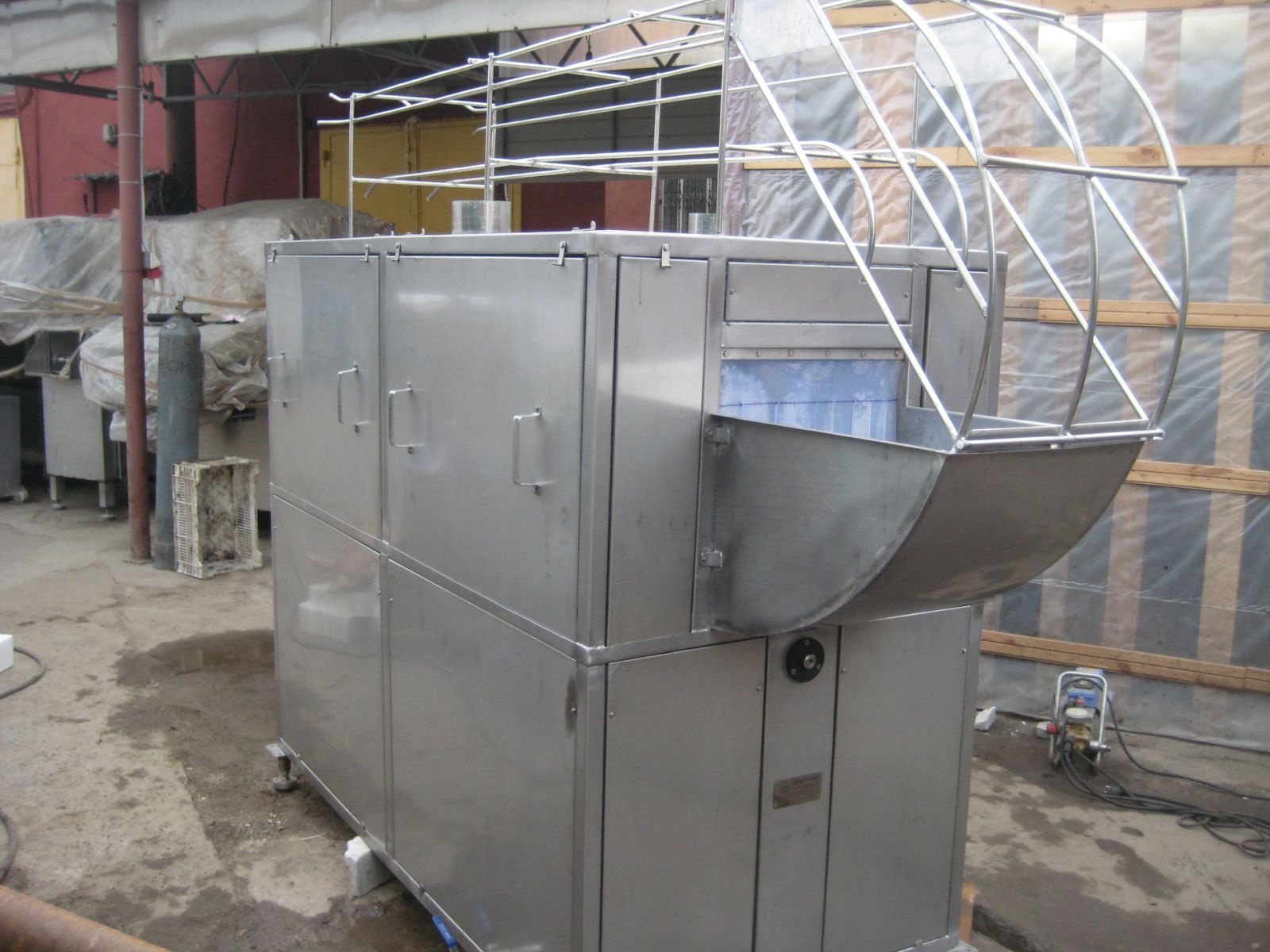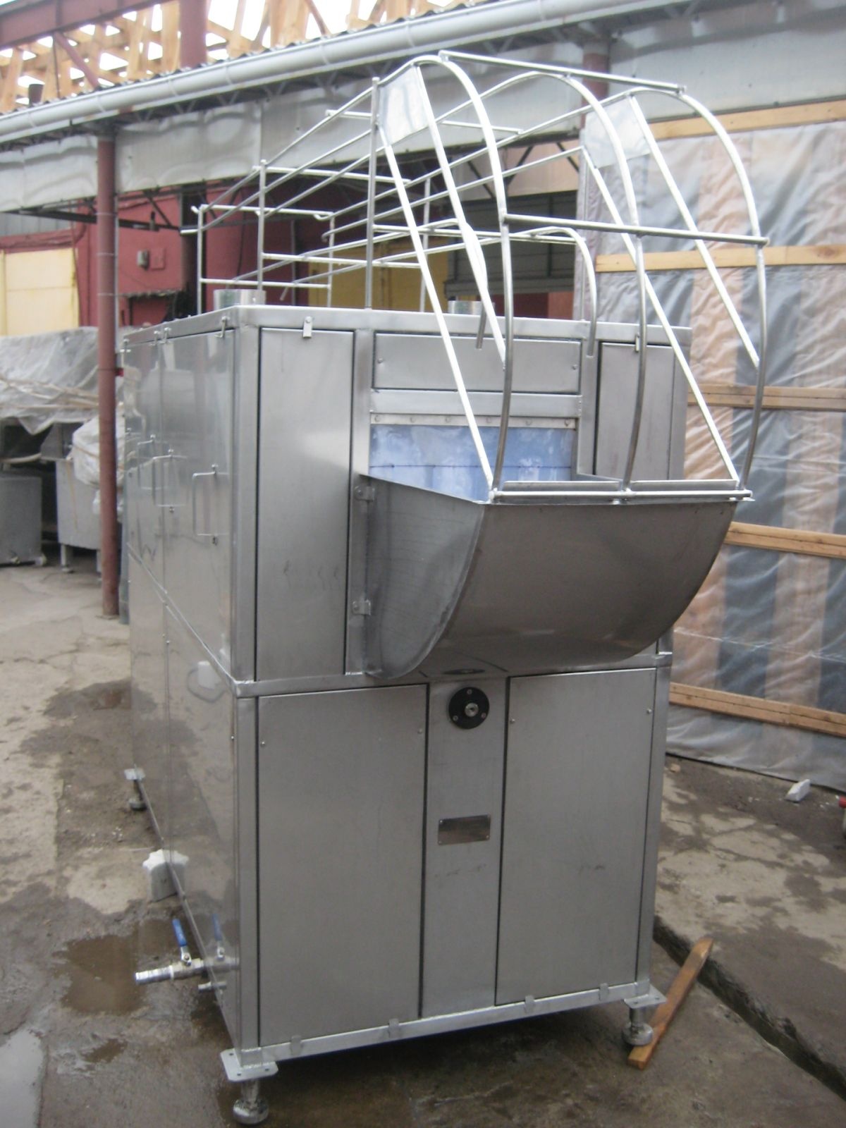 В верхнем корпусе установлены: моечная система, система ополаскивания и конвейер для перемещения ящичной тары по туннелю. В нижнем корпусе: резервуар для моющего раствора, силовой шкаф.