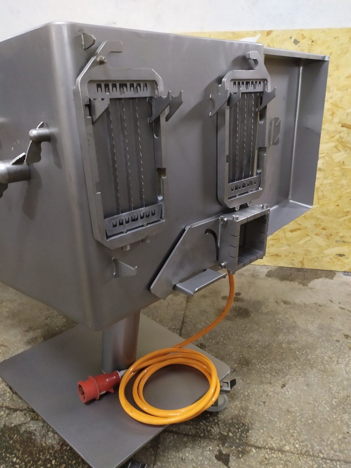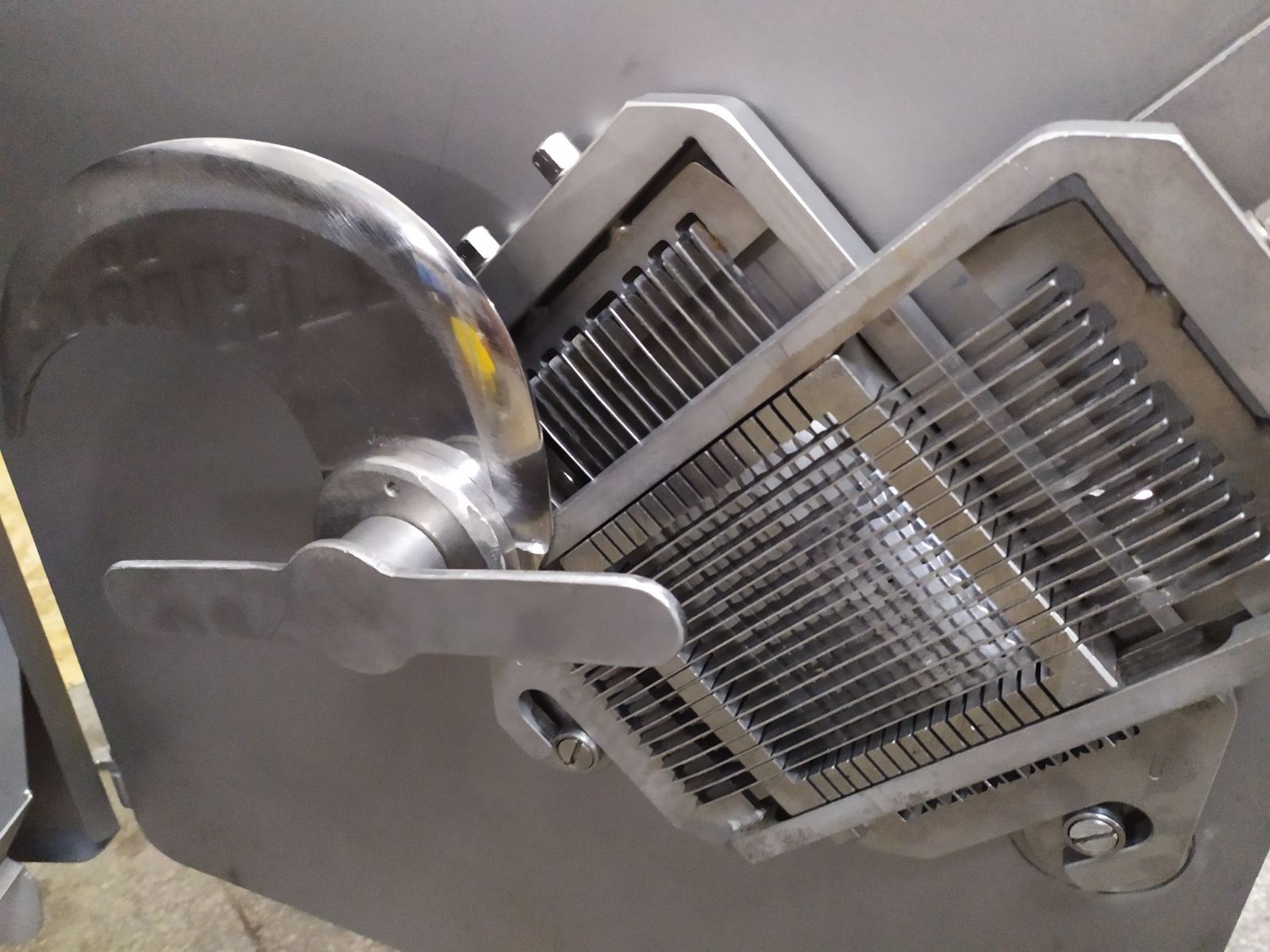 Шпигорезка RUHLE SR-1 TURBO , 2 комплекта решоток. Технические характеристики: Габариты машины ДхШхВ (мм): 900 x 600 x 980 Вес: 280 кг Мощность подключения: 1,5 кВт Предохранитель: 16 A Размер камеры резки ДхШхВ (мм): 100 x 100 x 350 Длина отреза (мм): 1 до 32 Число резов в минуту: 160 Температура резки: -5°C до +80°C Максимальная производительность: 1500 кг
