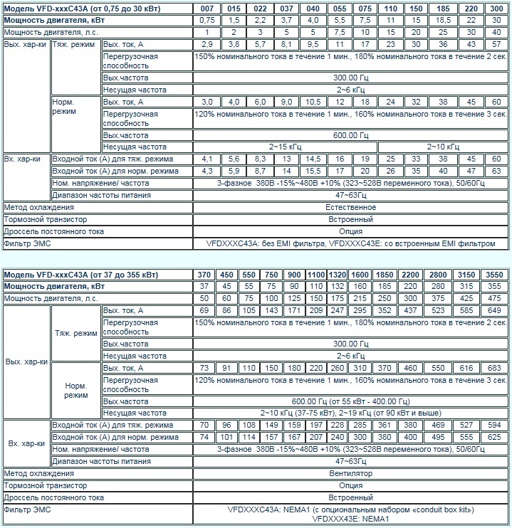 - Диапазон мощностей серии VFD-С: