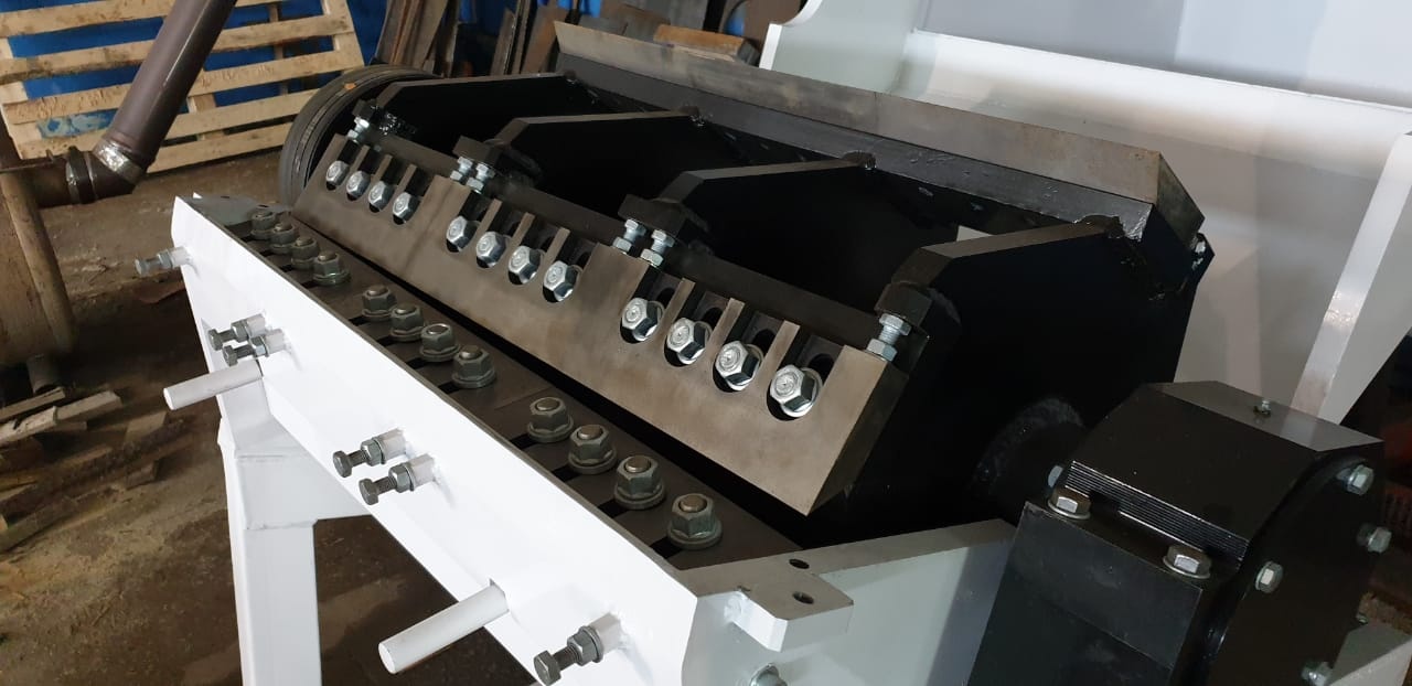 Дробилка моющая, косой рез. Двигатель 45 кВт, рабочая длина ротора 900мм, 12 роторных ножей, 6 стационарных. Дробит биг-бэг, пленки, мешки, ящики, канистры, ведра, ПЭТ-бутылки, кеги и прочий твердый пластик толщиной стенки до 12 мм. Производительность до 500 кг/ч в зависимости от сита.