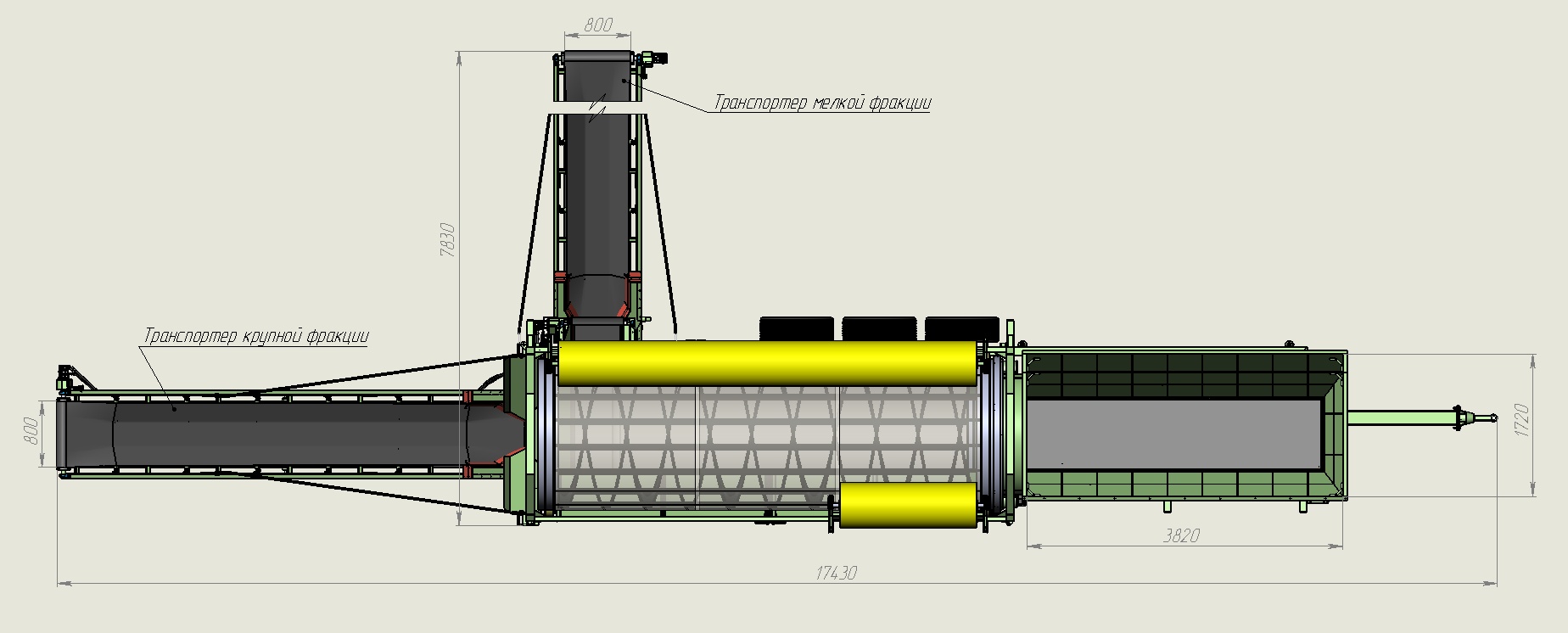 Диаметр барабана 1820 мм, длина просеивающей части 5050 мм.