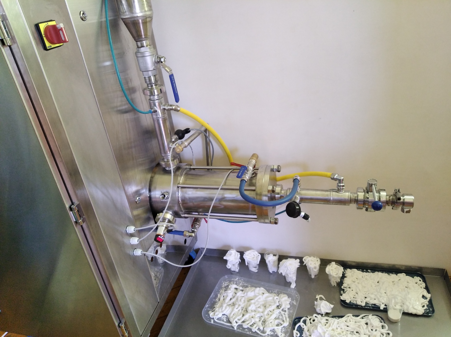 Основное оборудование для получения этого лакомства – аэратор для маршмеллоу – сложная установка, в которой реализованы различные физические процессы, например, подача воздуха под давлением, смешивание, гомогенизация продукта, получение пены, поддержание нужной температуры. Аэратор для маршмеллоу может иметь различную производительность и некоторые дополнительные опции. Помимо аэратора, для производства маршмеллоу понадобятся транспортеры, механизмы для нарезки, вибросито, варочные и смесительные емкости.