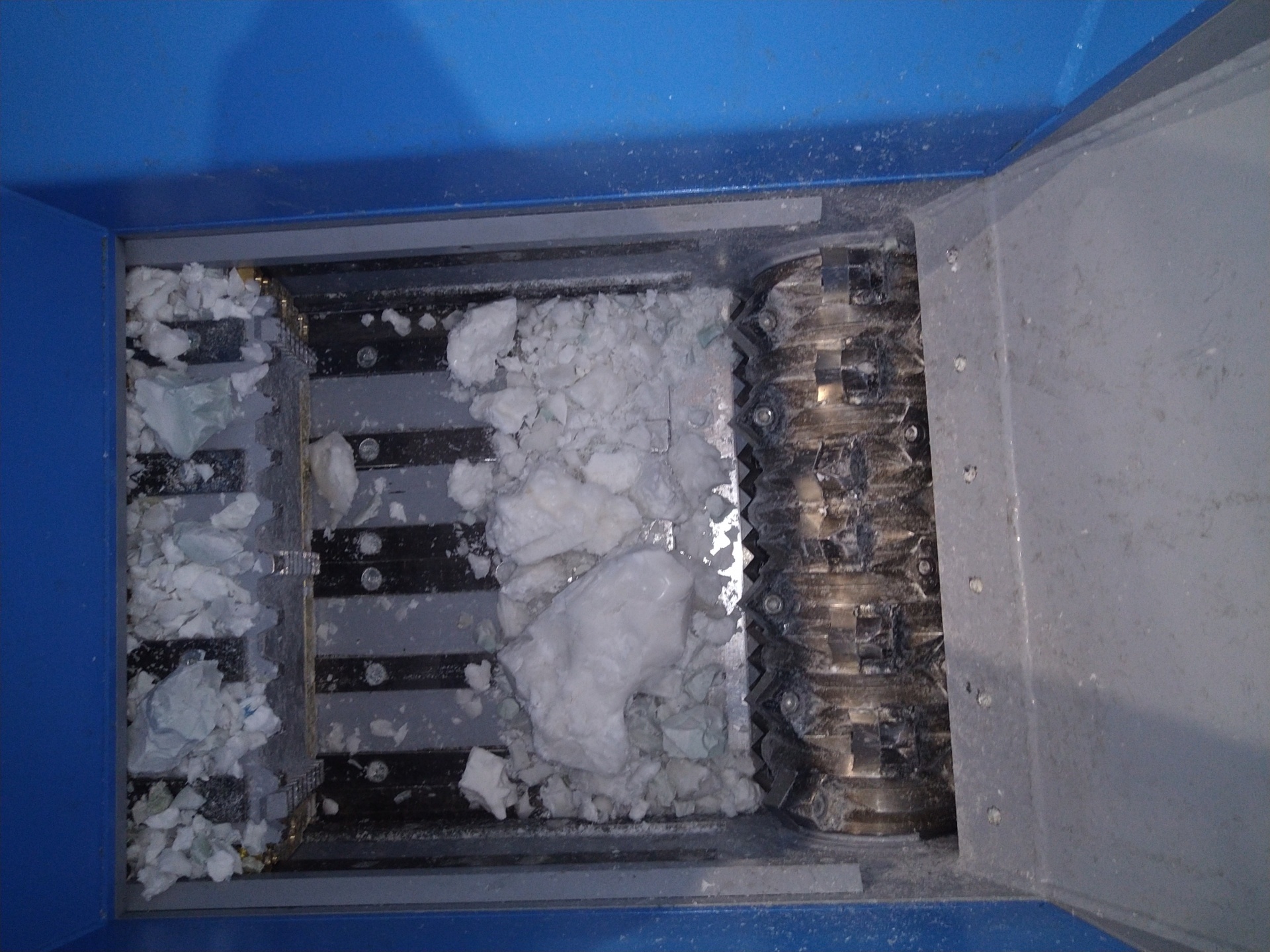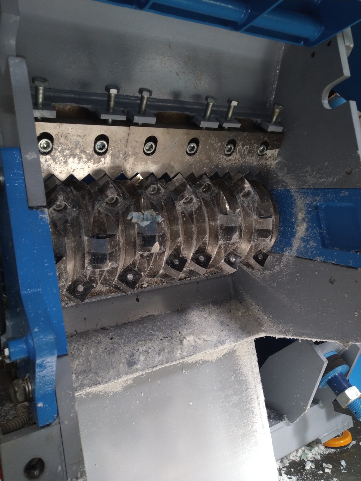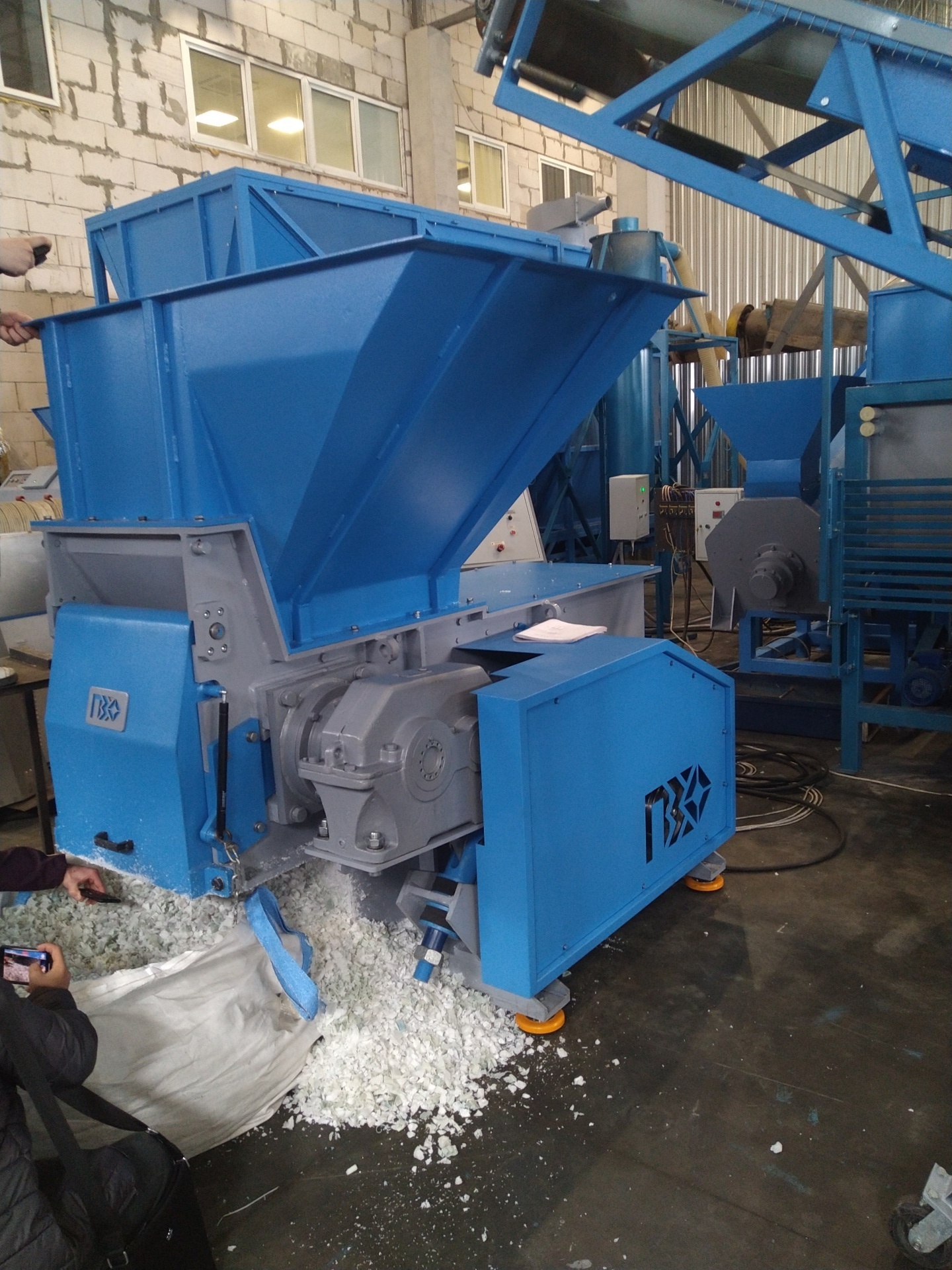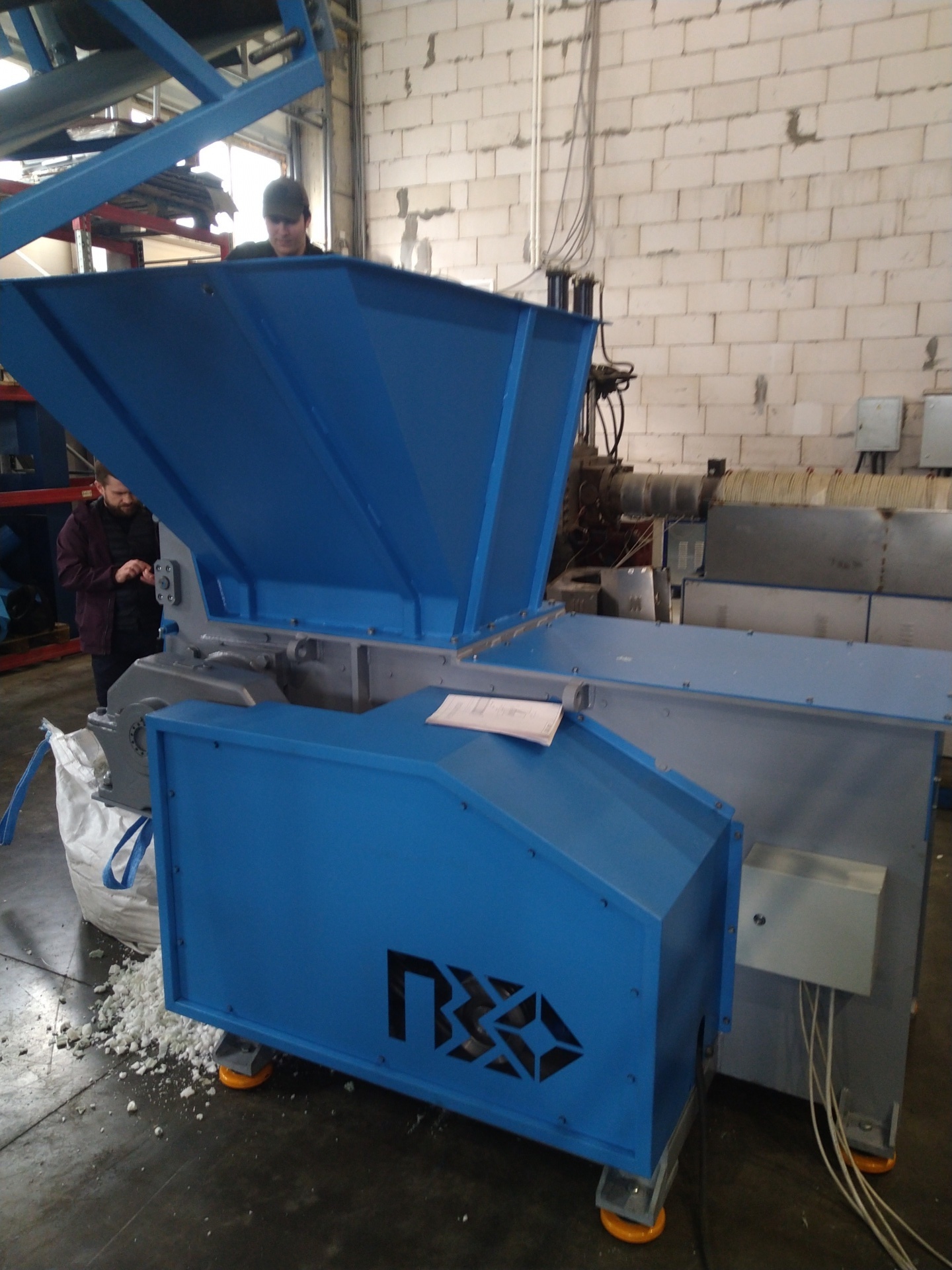 В наличии однороторный низкоскоростной измельчитель PZO 600 (шредер). Предназначен для измельчения крупногабаритных и тяжелых в переработке отходов: пластиковые трубы, литники, слитки, оплои, дерево, поддоны, бочки, картонные гильзы. Прижимная плита при помощи гидравлического цилиндра прижимает сырье к вращающемуся ротору с ножами.