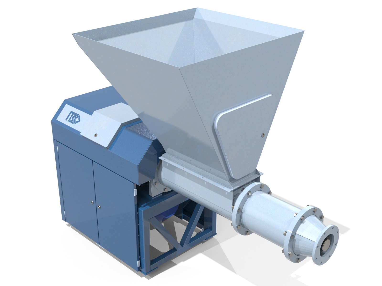 Описание процесса: cырье с низкой насыпной плотностью загружается в бункер. Оттуда сырье дозируется вращающимся шнеком напрямую к загрузочной зоне экструдера. В бункере установлены автоматические ворошители, исключающие зависание материала.