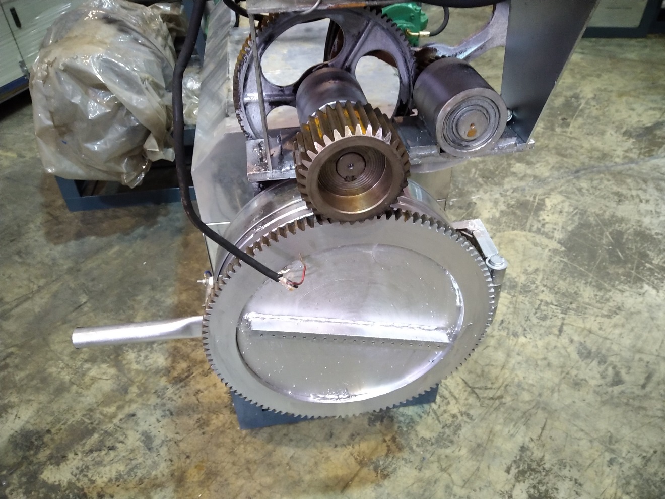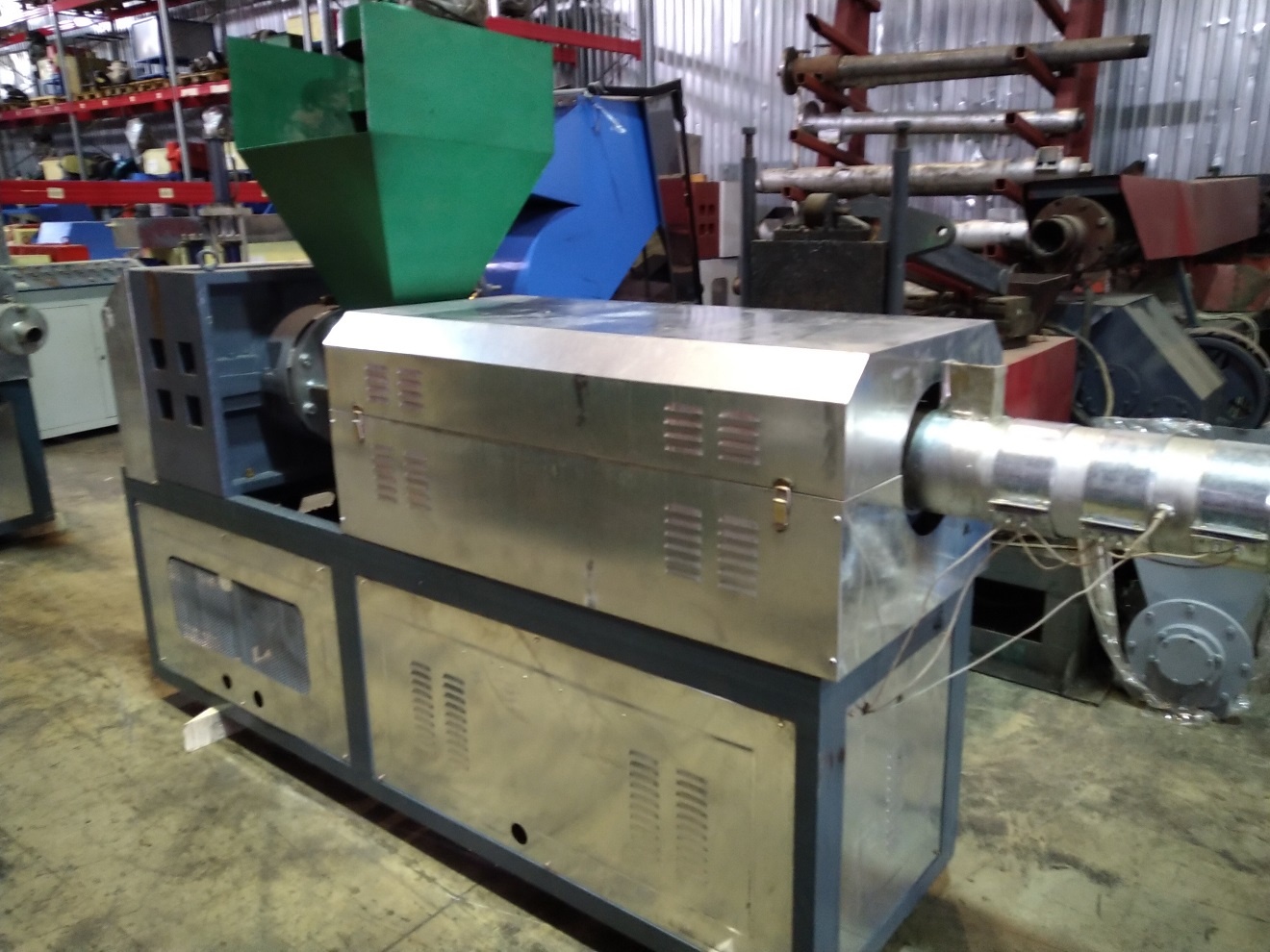 - Второй каскад: длина шнека 1200мм, ширина 140мм, 45 сталь, обработанная ТВЧ, двигатель 22кВт с редуктором, 4 зоны нагрева, укомплектован инфракрасными и металлическими ТЭНами, круглая формующая голова (рекомендуется установка частотного регулятора и фильтра расплава с фильерой)
