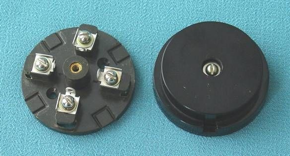 Состоит из карболитового основания с винтовыми зажимами для провода и пластмассовой крышки .