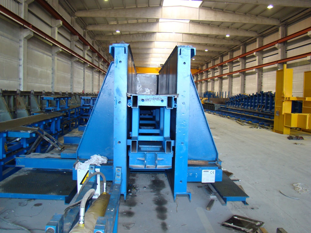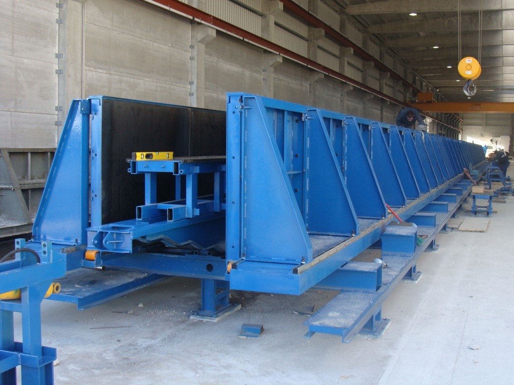 Нижний упорный щит формы размещен на гидравлической платформе, которая позволяет регулировать высоту поперечного сечения изделия. Более того, днище может быть заменено на аналогичное основание другой ширины. С другой стороны, в различные места бортов и днища могут быть вставлены консольные форм-модули, они могут смещаться вдоль формы, обеспечивая максимальную степень свободы, когда речь заходит о позиционировании консолей на колонне из сборного бетона.