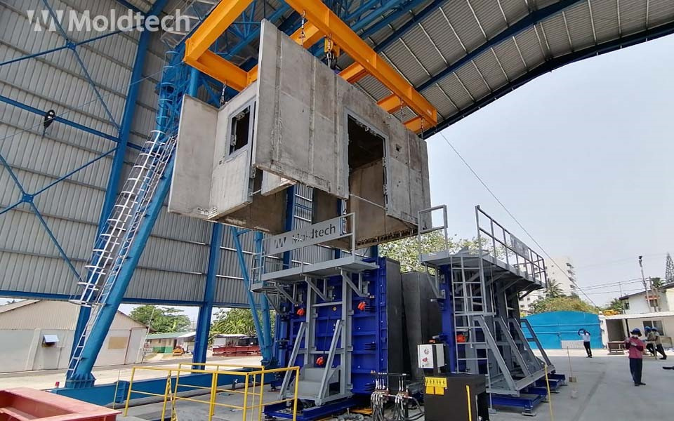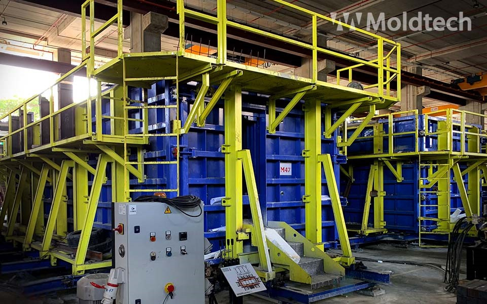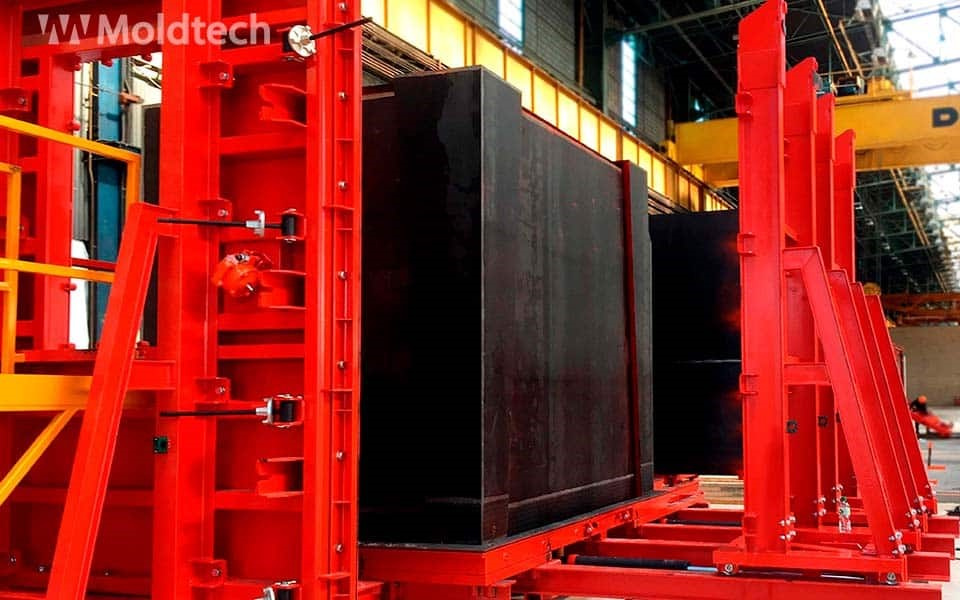 Боковые борта легкосъемные с использованием системы шпиндель-гайка, позволяя открывание формы и ее съем при помощи кран-балки за очень короткое время. Для облегчения распалубки форма производится с минимальным значением обратного конуса.