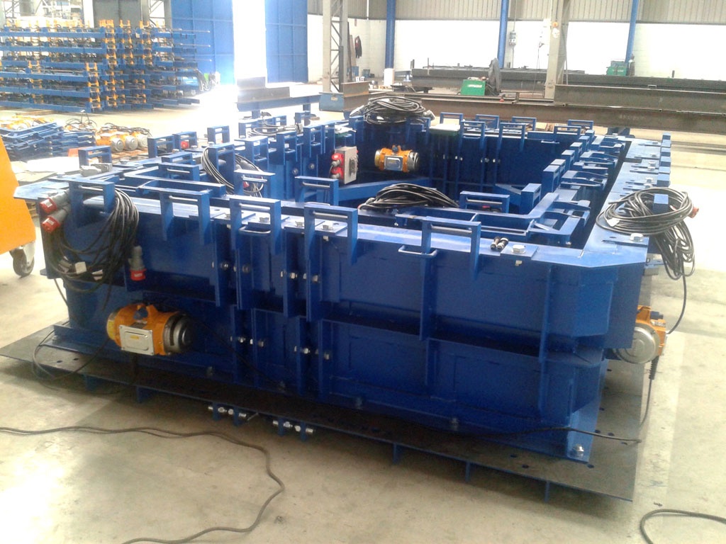 Модульная форма для производства сочлененных крупногабаритных элементов лоткового типа – это многофункциональная переналаживаемая установка, специально разработанная для производства сочлененных крупногабаритных лотков различных размеров. Ее конструкция может варьироваться по ширине, высоте и глубине. Это позволяет осуществлять производство лотков с шириной более 8 м и высотой 3 м, которые могут быть установлены на месте проведения работ на аналогичные перевернутые элементы, а также на сборные или монолитные железобетонные плиты.