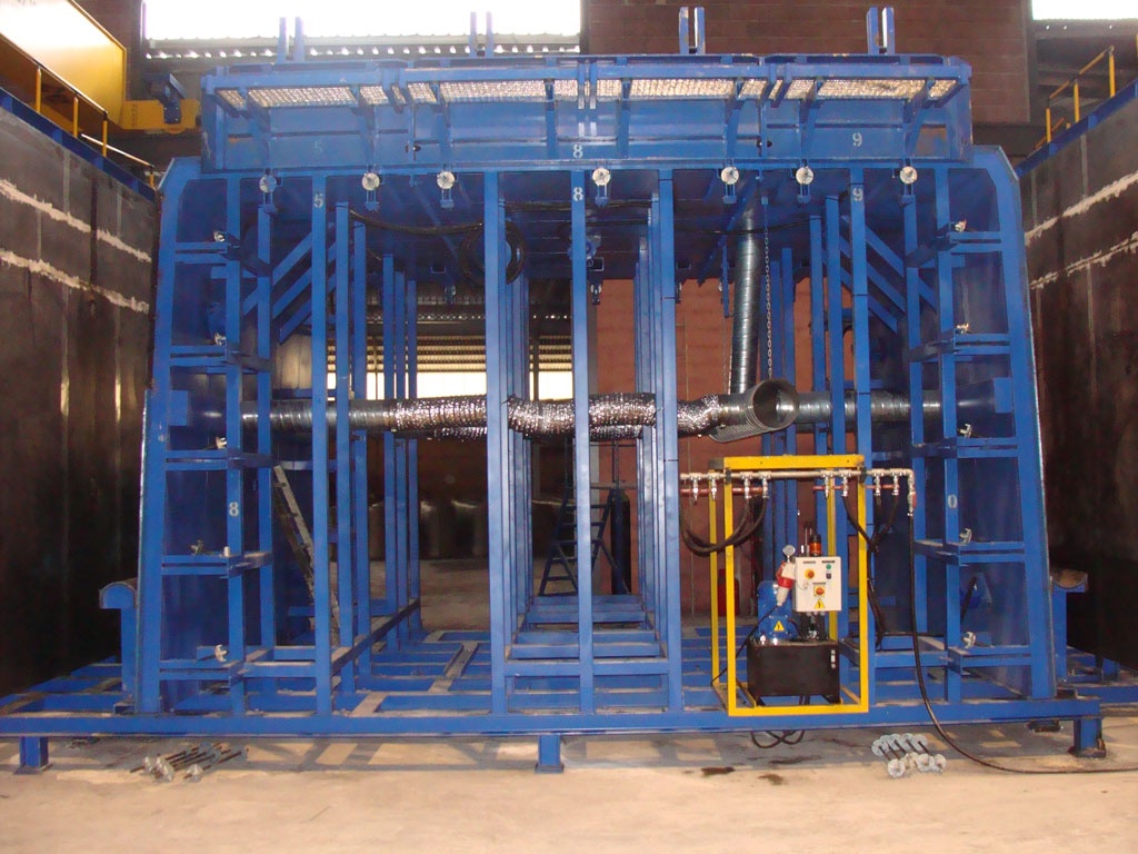 Для открывания и закрывания наружной опалубки формооснастка имеет гидравлические приводы, что позволяет ускорить серийное производство изделий. Внутренняя форма имеет конический скос. После отвердения бетона и раскрытия наружной формы остается лишь произвести съем готового изделия, повторно нанести адгезивное средство, уложить арматуру, закрыть форму и произвести очередную заливку бетона.