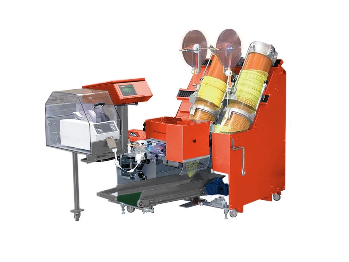 Высокоскоростная фасовка округлых овощей, фруктов в сетку-рукав с клипсой порциями от 0,5 до 3 кг. После завершения наполнения одной трубы автоматически начинается подача продукта в другую.