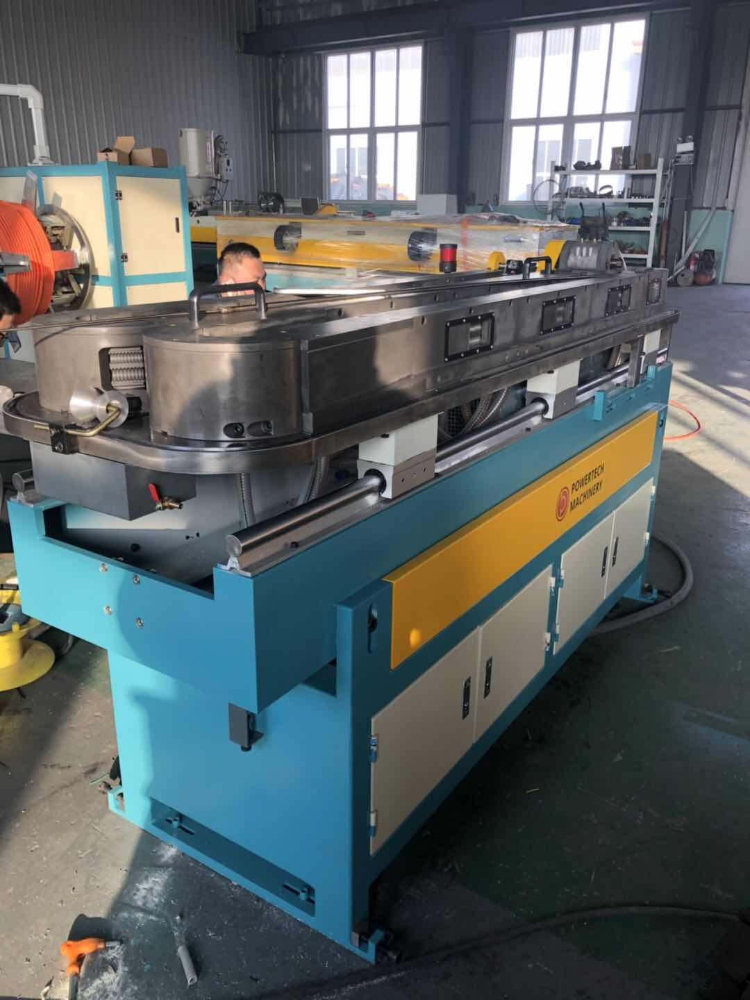 Экструзионную трубную голову специально разработанную для гофрированной трубы. Трубная головка имеет экструзионные фильеры для типоразмеров от 16 мм до 50 мм (по требованию от клиента) и отверстия для подключения воздуха (для раздува трубы) и подачи проволоки (зонда)