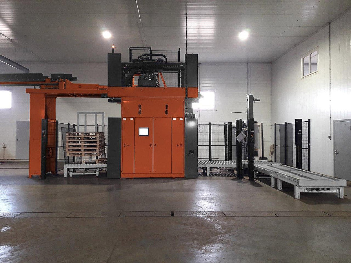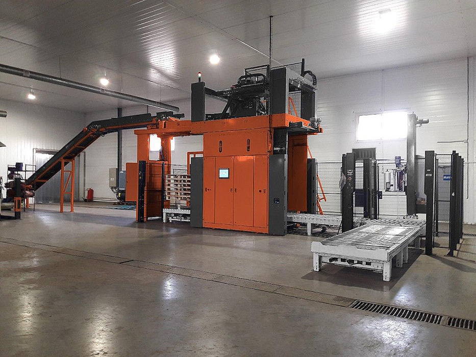 Заполнение (затаривание) сеток на завязках с помощью двух рабочих зон. Сетки наполняются по объёму (без веса). На каждой рабочей зоне может работать от 1 до 3 человек (1-й сотрудник наполняет сетку, 2-й - завязывает, 3-й - укладывает на паллеты).