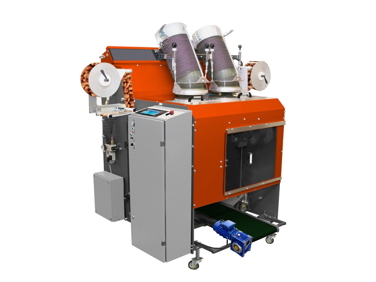 - 2-трубная система позволяет оборудованию длительно работать без остановки: после завершения упаковочного материала на одной трубе, машина автоматически переводит упаковку овощей и фруктов на другую трубу