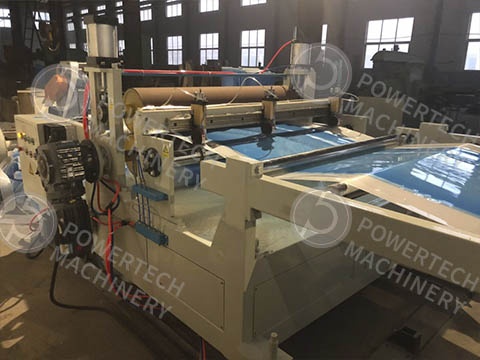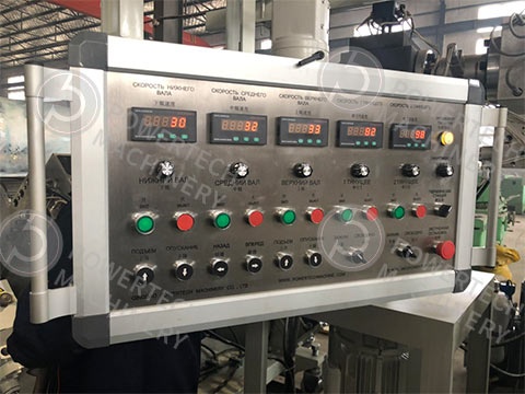 Каландровую систему валов, которая служит для калибровки толщины листа. Каждый вал оснащен мотор-редуктором с частотным регулированием оборотов вращения. В зависимости от выпускаемого листа можно использовать трех валковый или четырех валковый каландр. Валы хромированы и отполированы, а также оснащены жидкостным контуром для терморегулировки. Прижим валов каландра осуществляется гидравлическим или электрическим способом.