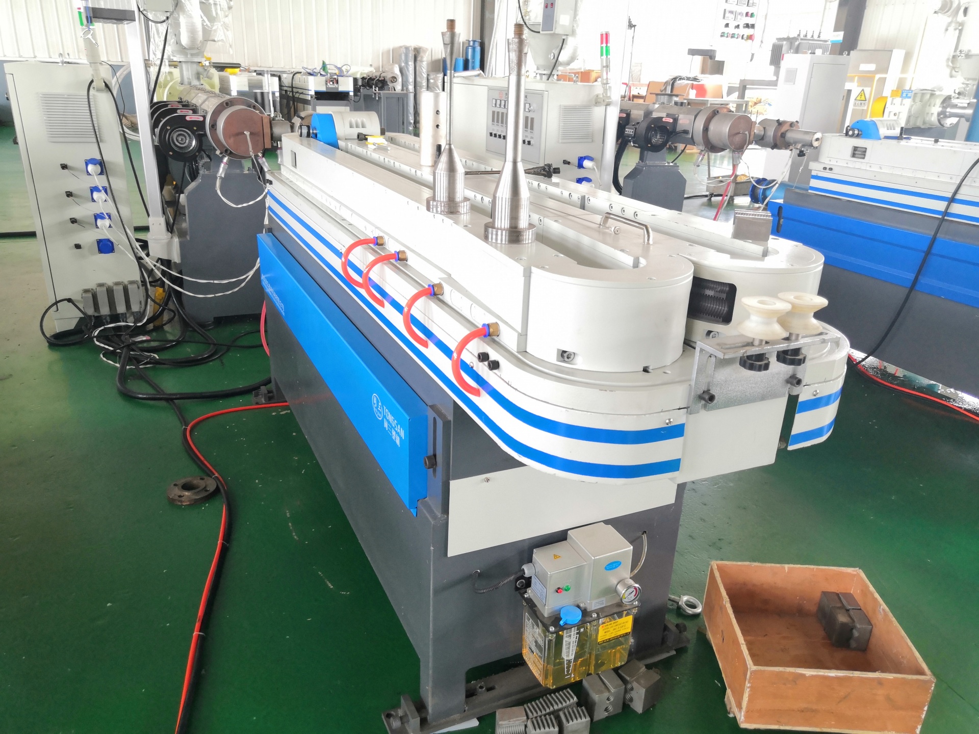 Специально дизайнируя на базе оригинальной линии, данная производственная линия для изготовления однослойной пластиковой гофротрубы с помощью шестерни для передачи блоков на канале, имеет специальную водяную охлаждающую систему уплотнения с автоматическими инжектом смазкой. В формующем устройстве для маленьких блоков в фильере имеются два помещения с управлением электродвигателем наверху и внизу. Все эти элементы повышают производственную скорость, которая может достичь 20 м/мин. Помимо того, ещё и поставлен охлаждающий прибор для элиминации стресса гофротрубы и автоматический открывающийся станок с функцией автоматической намоткой, что особенно подходит к производству гофротрубы для автомабильной проводки.